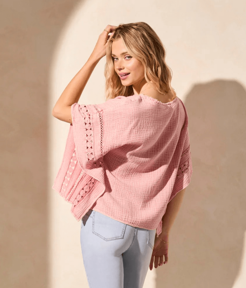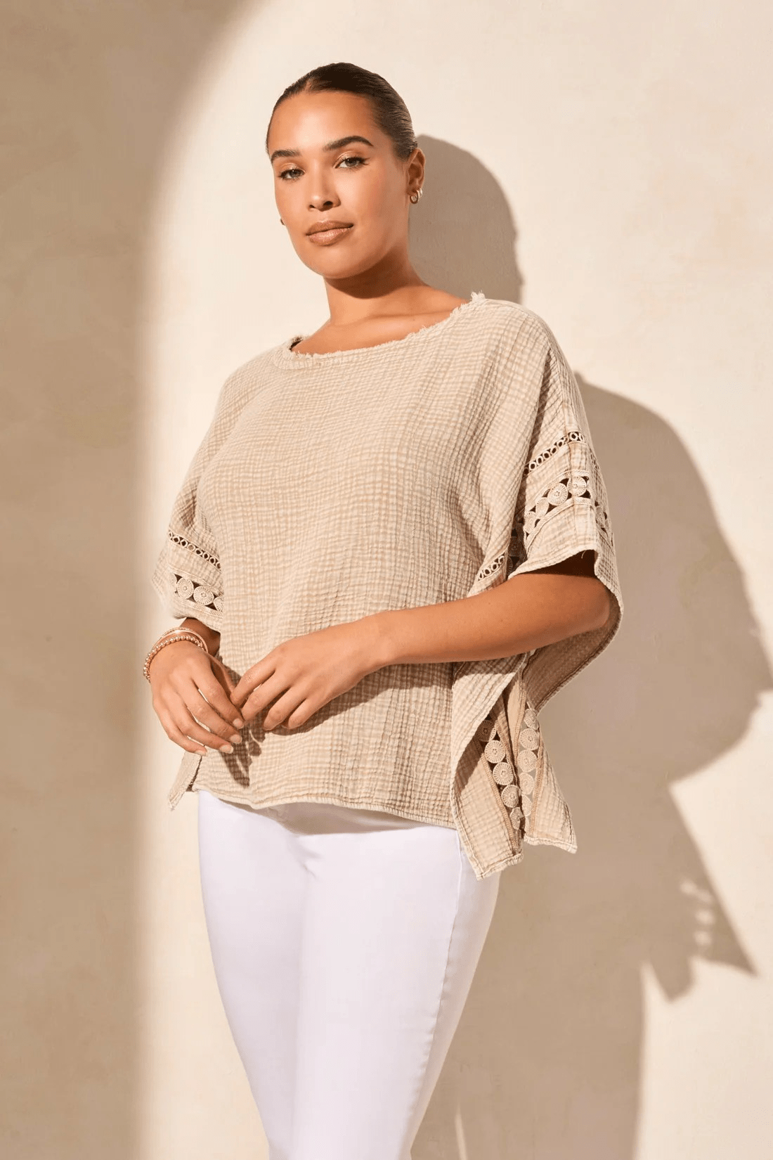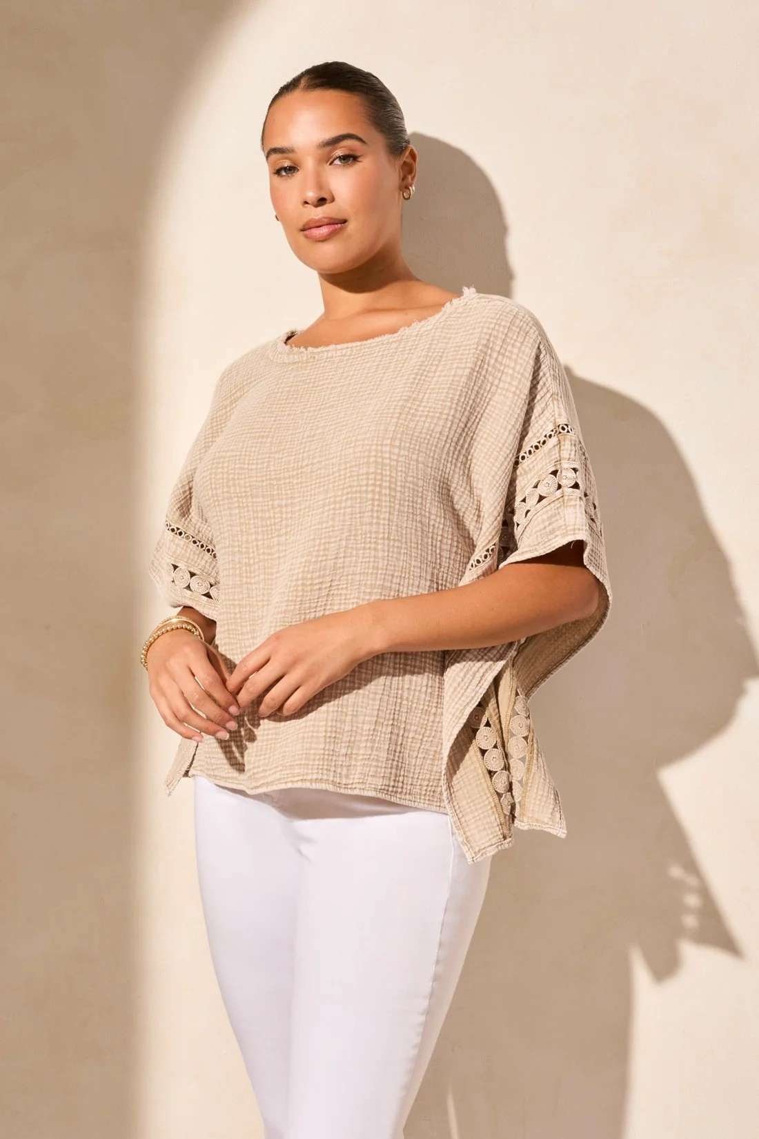 Vintage Wash Cotton Gauze Kaftan Blouse With Fancy Trim - Crew neck, Flowy short sleeves, Vintage wash, Fancy trim at sleeves, Cotton gauze fabric.
