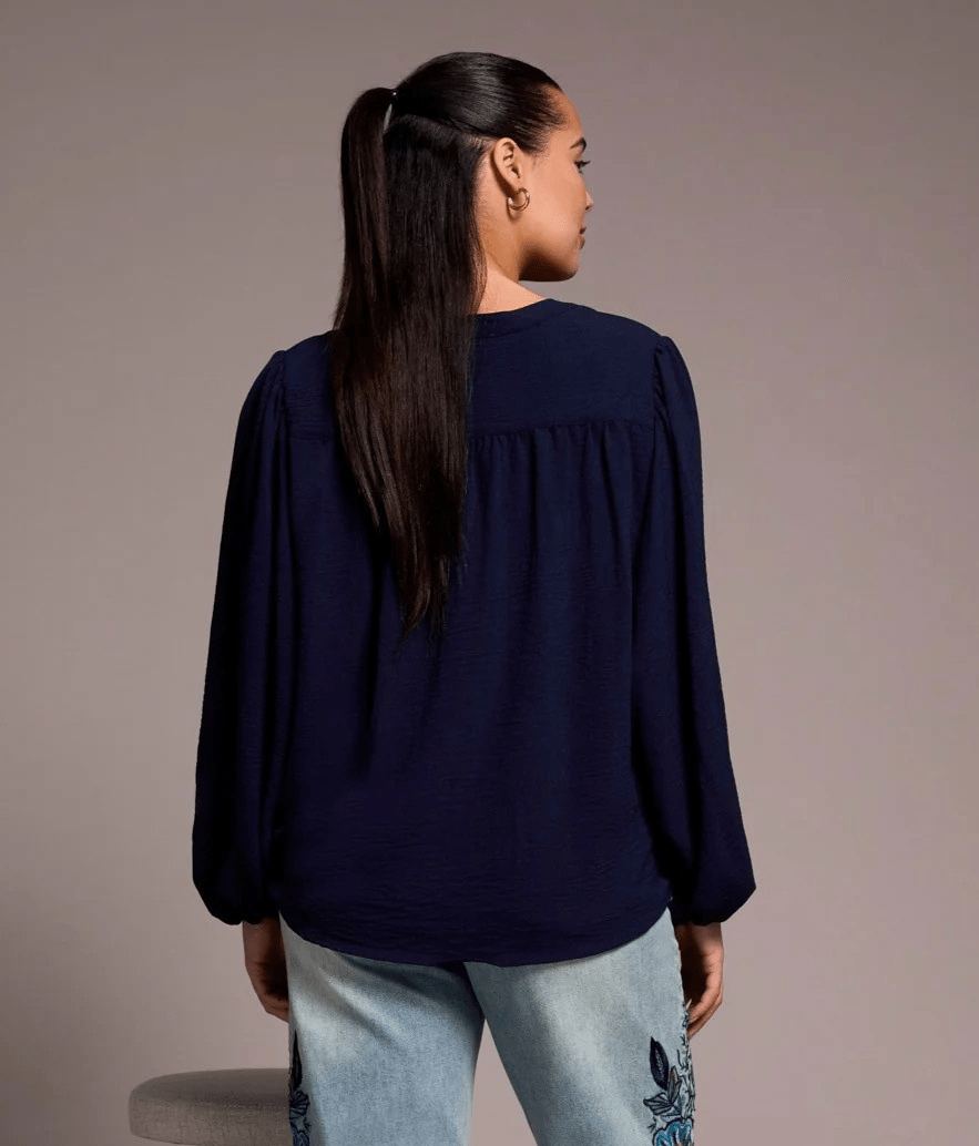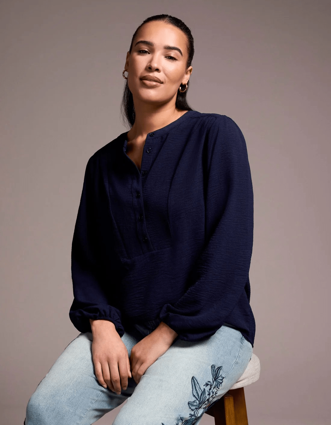 Embrace effortless style with airy woven fabric that drapes beautifully for a breezy feel. Featured with a buttoned placket that adds a polished touch to the crew neckline, it also offers long sleeves for graceful coverage. Subtle shirring and a folded hem enhance the refined silhouette, striking the perfect balance between casual and stylish.