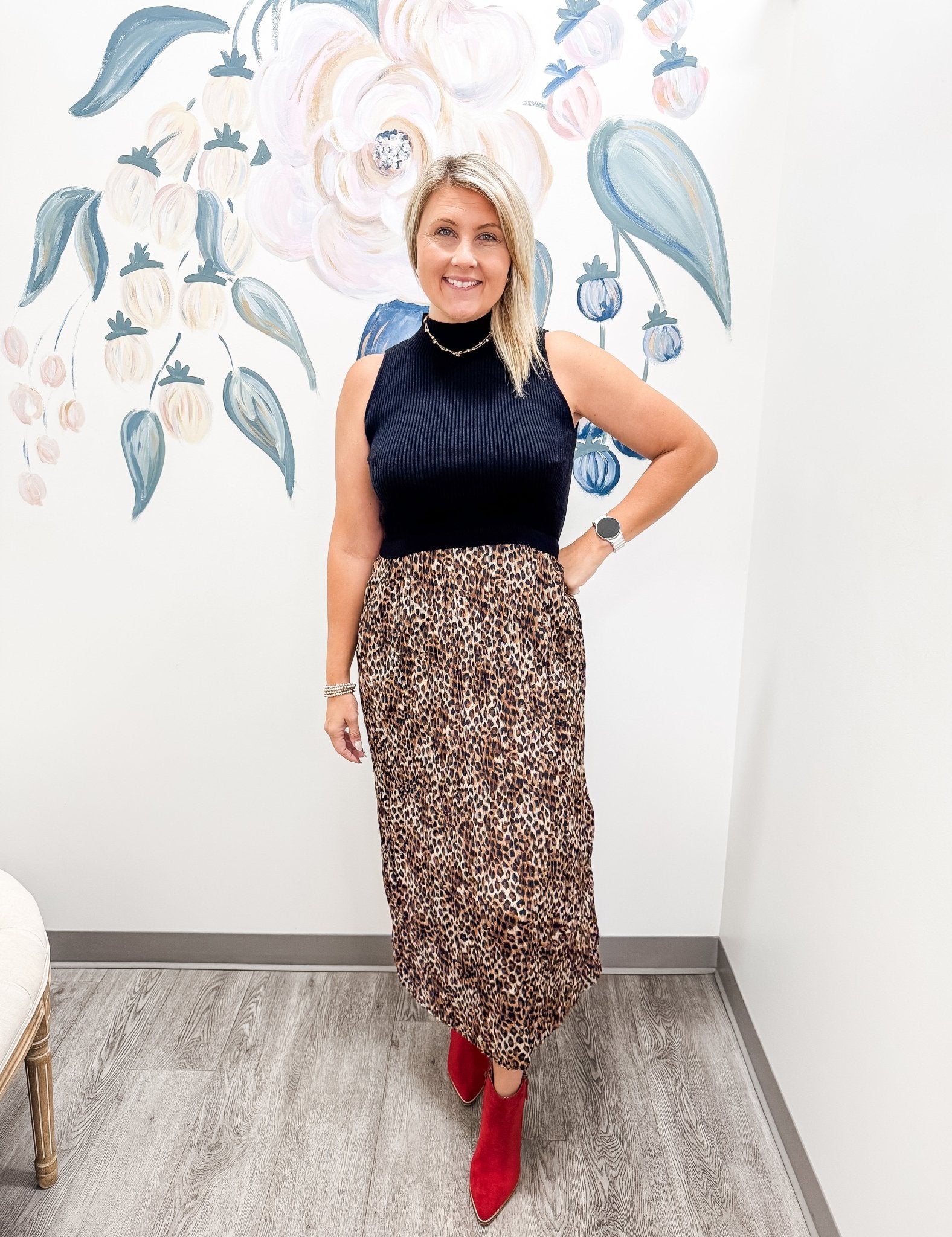 Make a graceful statement in this elegant maxi dress, designed to keep you cool with its sleeveless silhouette. The crinkle peach skin fabric flows effortlessly, while the contrast maxi-length skirt adds a striking touch. Featuring a mock neckline, it enhances its refined appeal for a polished, sophisticated look.