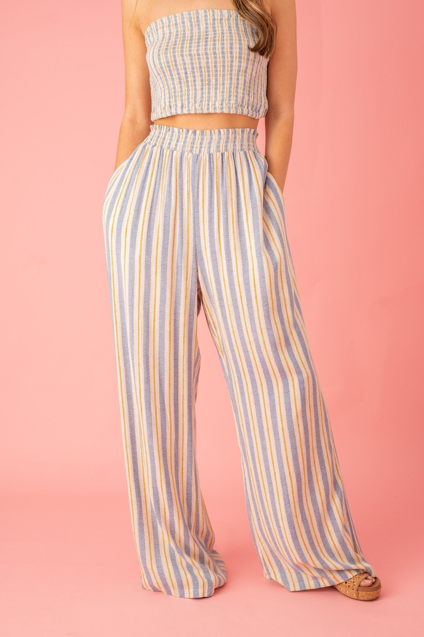 RAYON STRIPED SMOCK BANDEAU TOP AND PALAZZO PANTS -Top and Pants Set -Crop Top -Smocked Top -Striped -Rayon Fabric -Full Length Pants -Palazzo Pants -Side Pockets -High Waist.