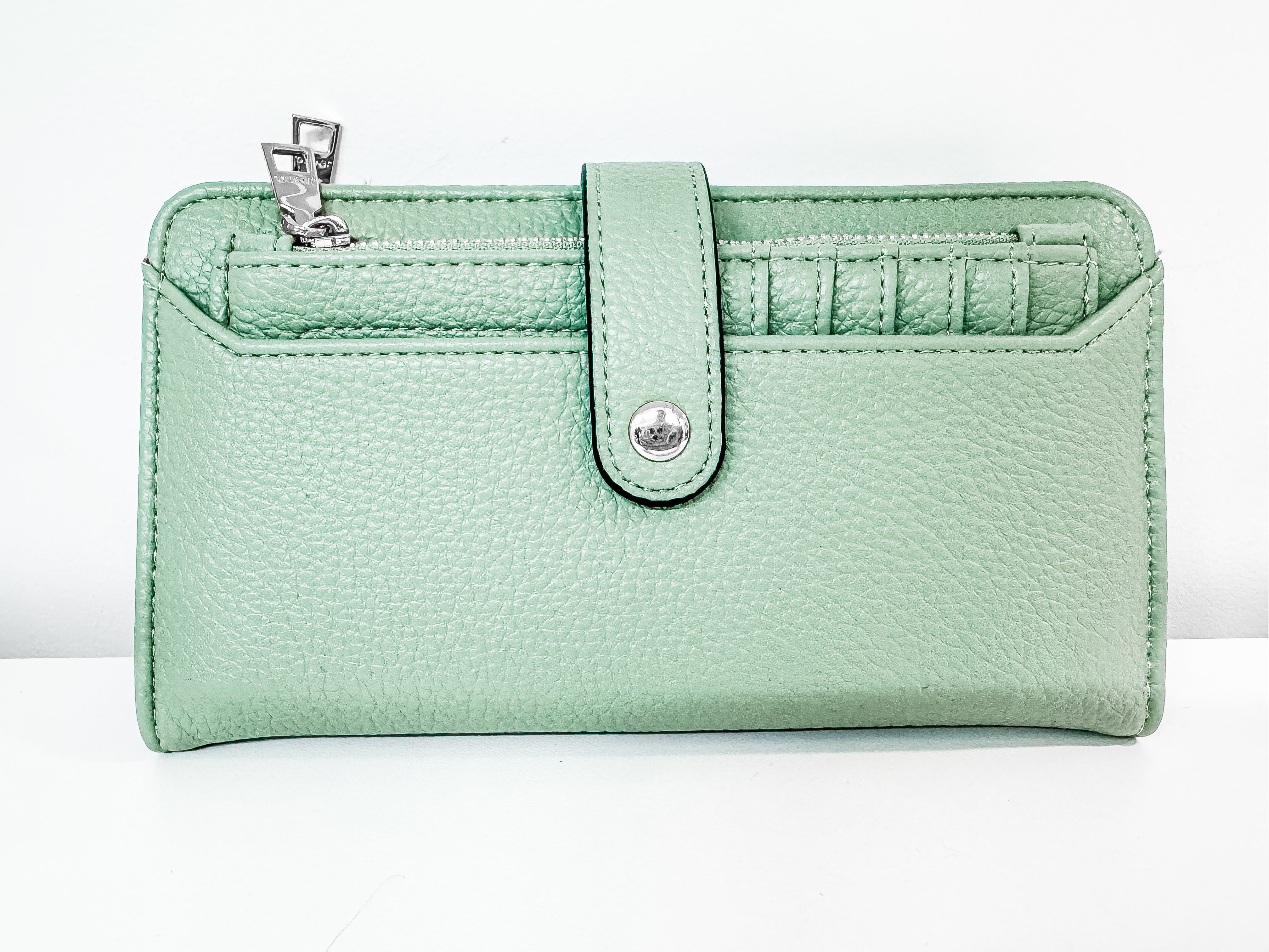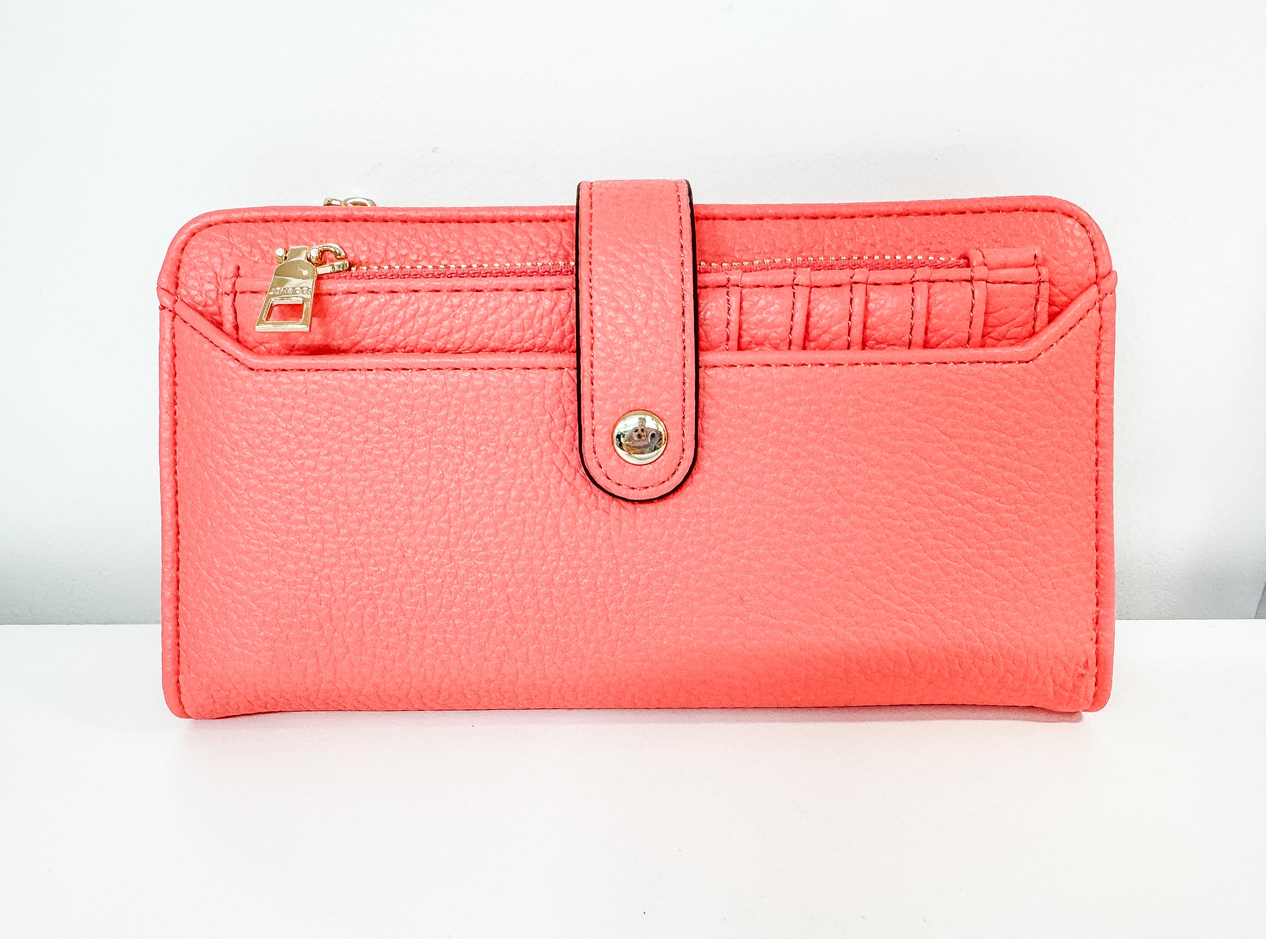 Fold out wallet with snap closure and top zip pocket. Front slip pocket with removable card slot wallet and zip pocket. Inner card slots and slip pockets.