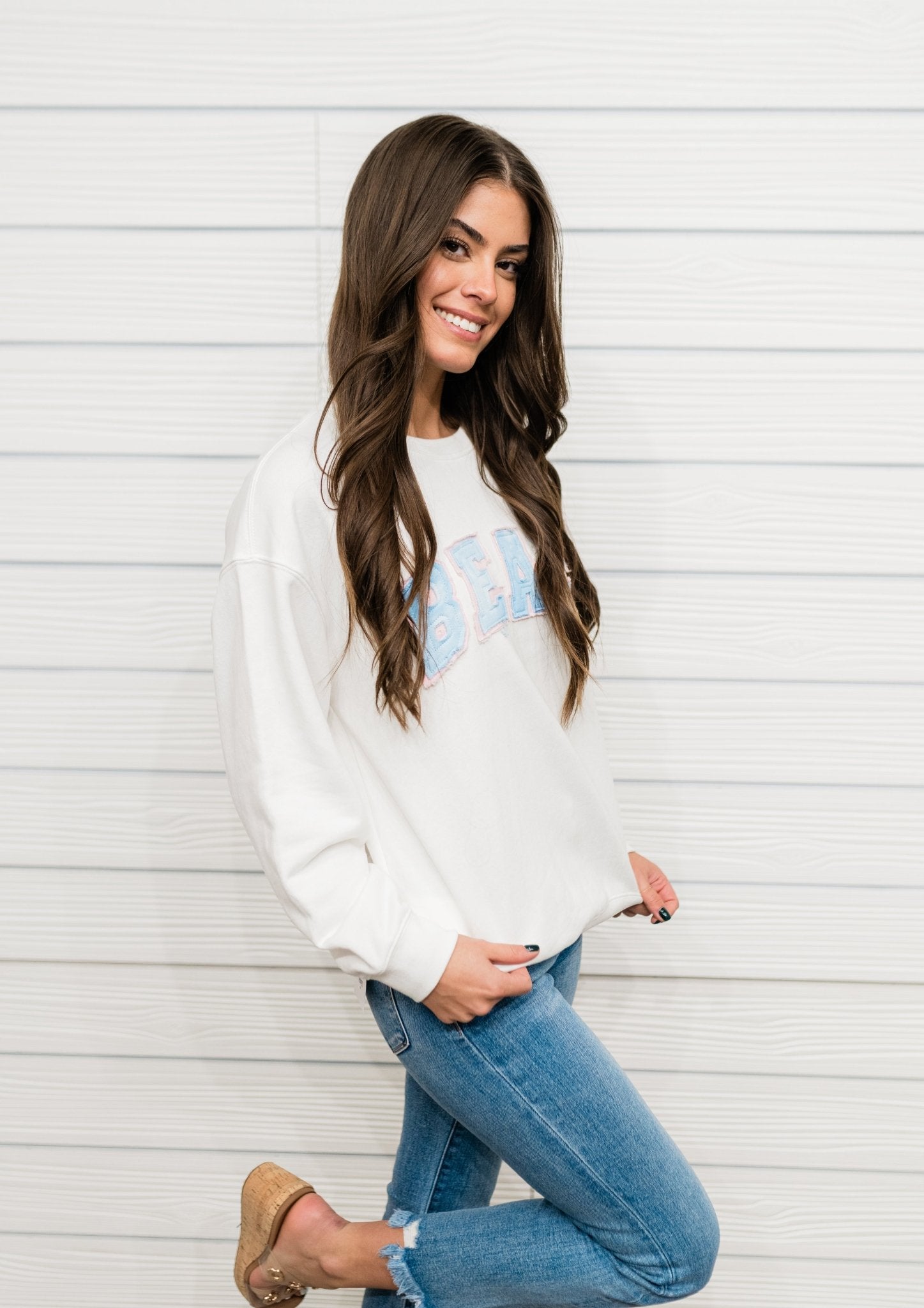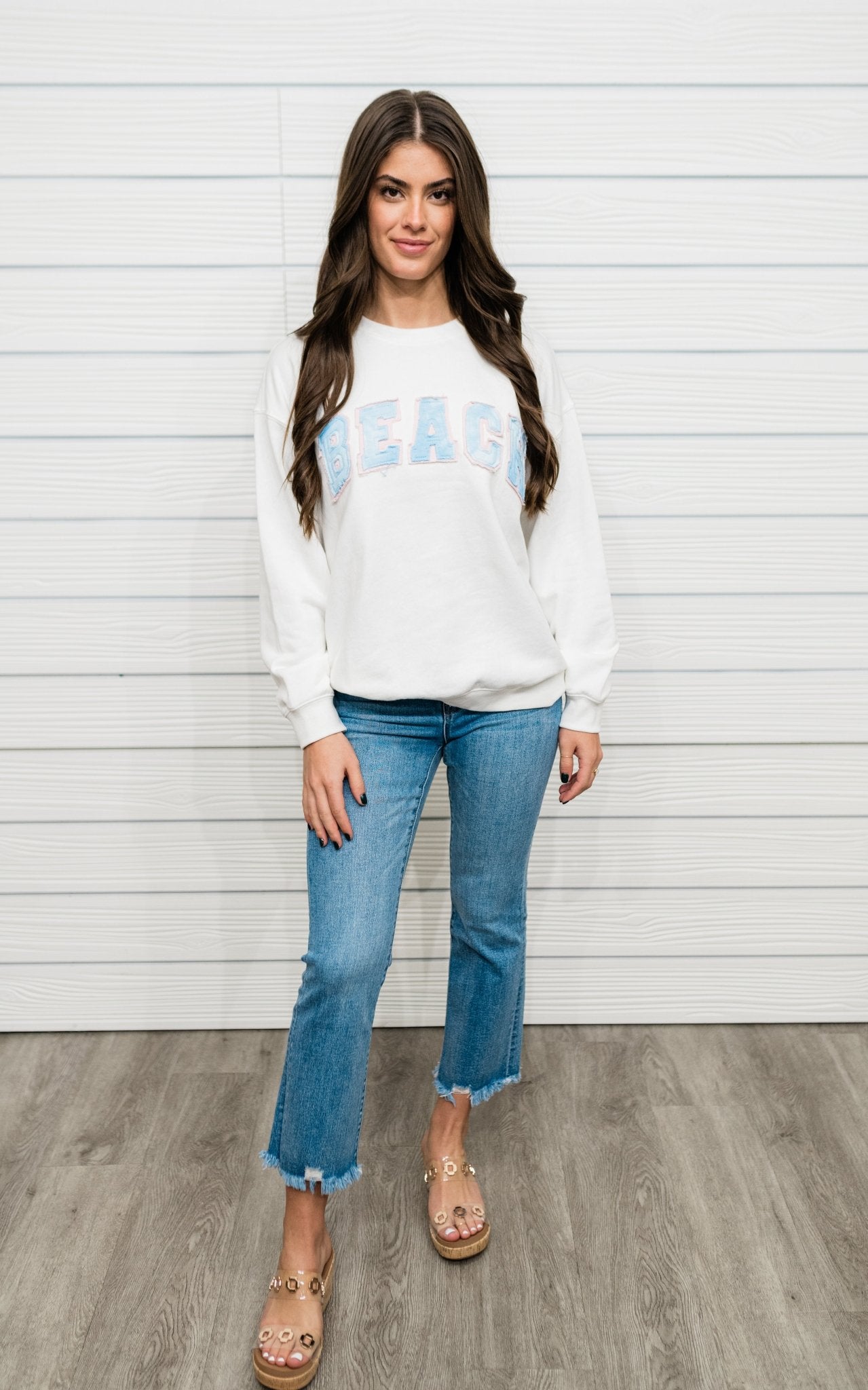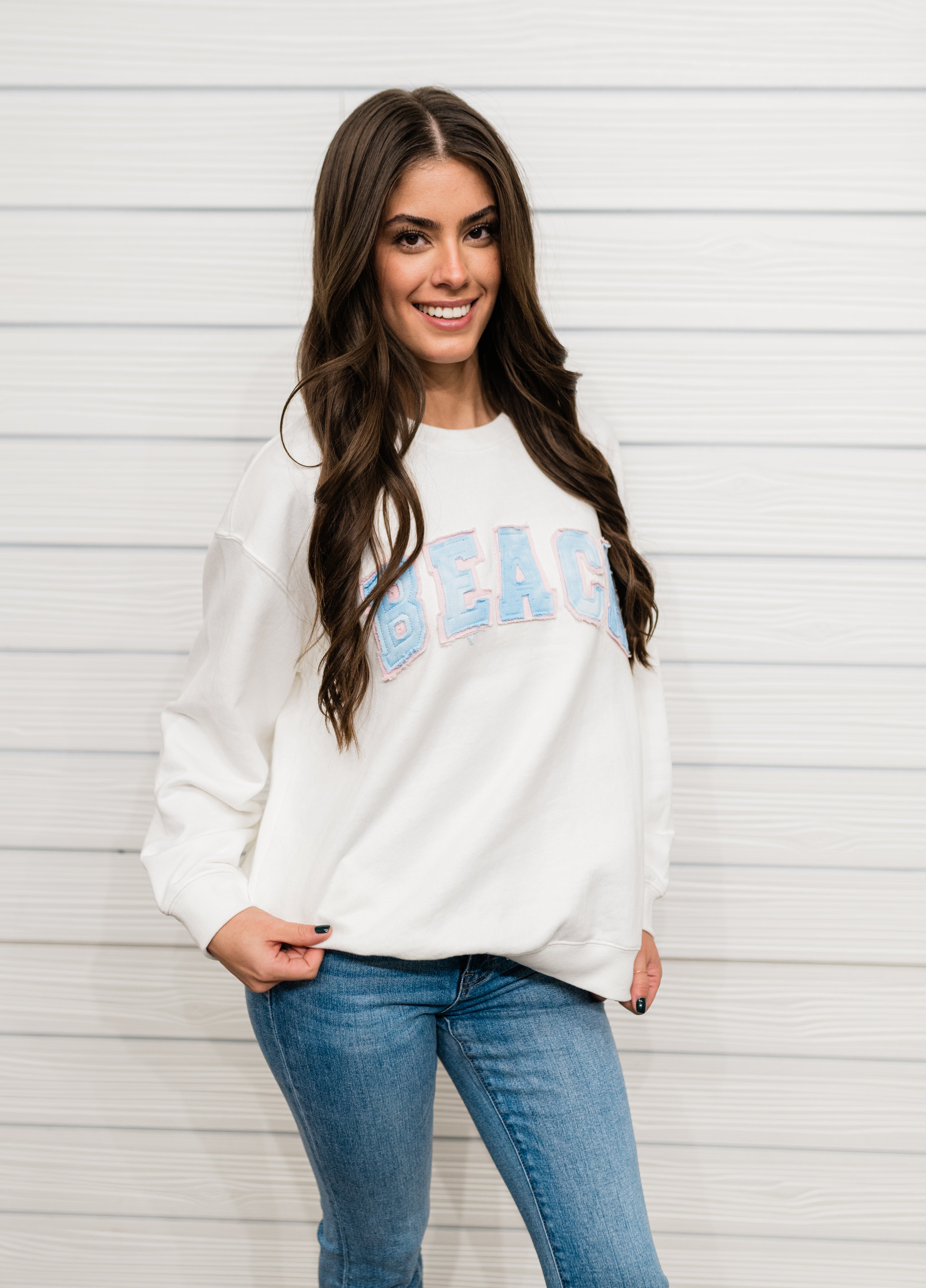 Introducing our "Beach" Babe Terry Sweatshirt for the perfect combination of cozy and comfortable. This sweatshirt features a playful "BEACH" patch sewn on the front in fun pastel colors, made with high-quality fabric for a lasting addition to your wardrobe. Now you can bring the beach vibes with you wherever you go!