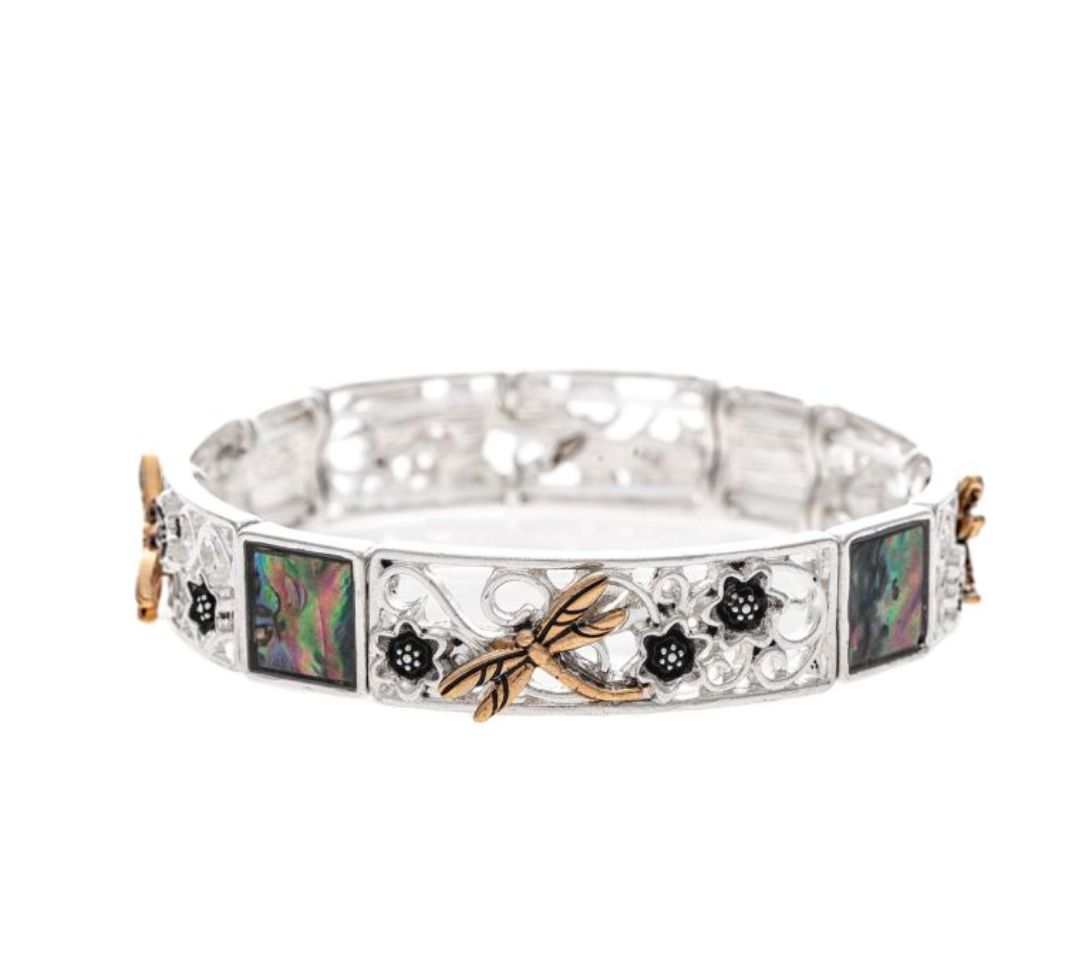 Let your style take flight with the Wings of Wonder Bracelet. This enchanting piece features intricate silver-toned filigree panels, adorned with delicate black floral accents and shimmering abalone shell inlays that reflect hues of deep green, purple, and ocean blue. Gracefully positioned across the center, a golden dragonfly spreads its wings in mid-flight — a symbol of transformation and lightness. The combination of mixed metals and natural textures creates a beautifully balanced design that feels both elegant and organic.