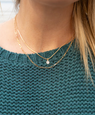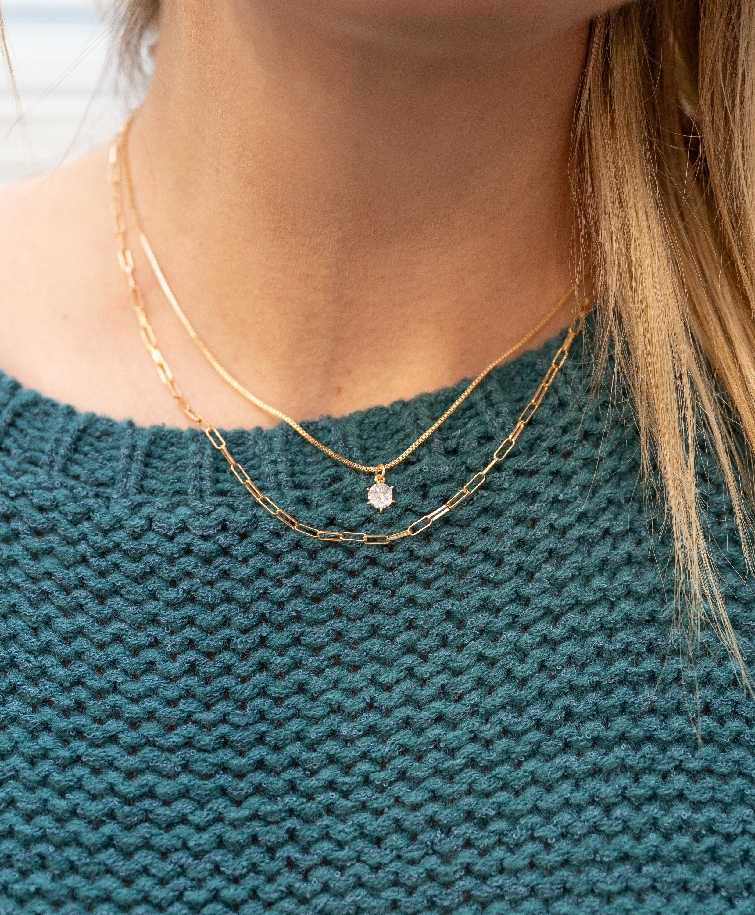 This elegant necklace features a double chain combo that features a stunning diamond pendant on one and a link design on the other, making it the perfect accessory for any occasion. The unique paper clip chain adds a touch of modernity to this timeless piece. Expertly crafted with quality materials, this necklace is sure to make a statement!