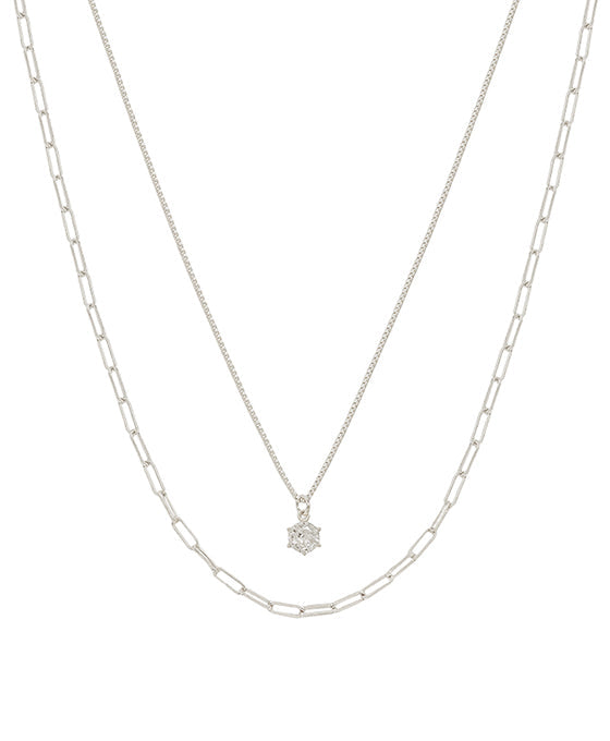 Layered Clip Chain & Cubic Pendant Short Necklace