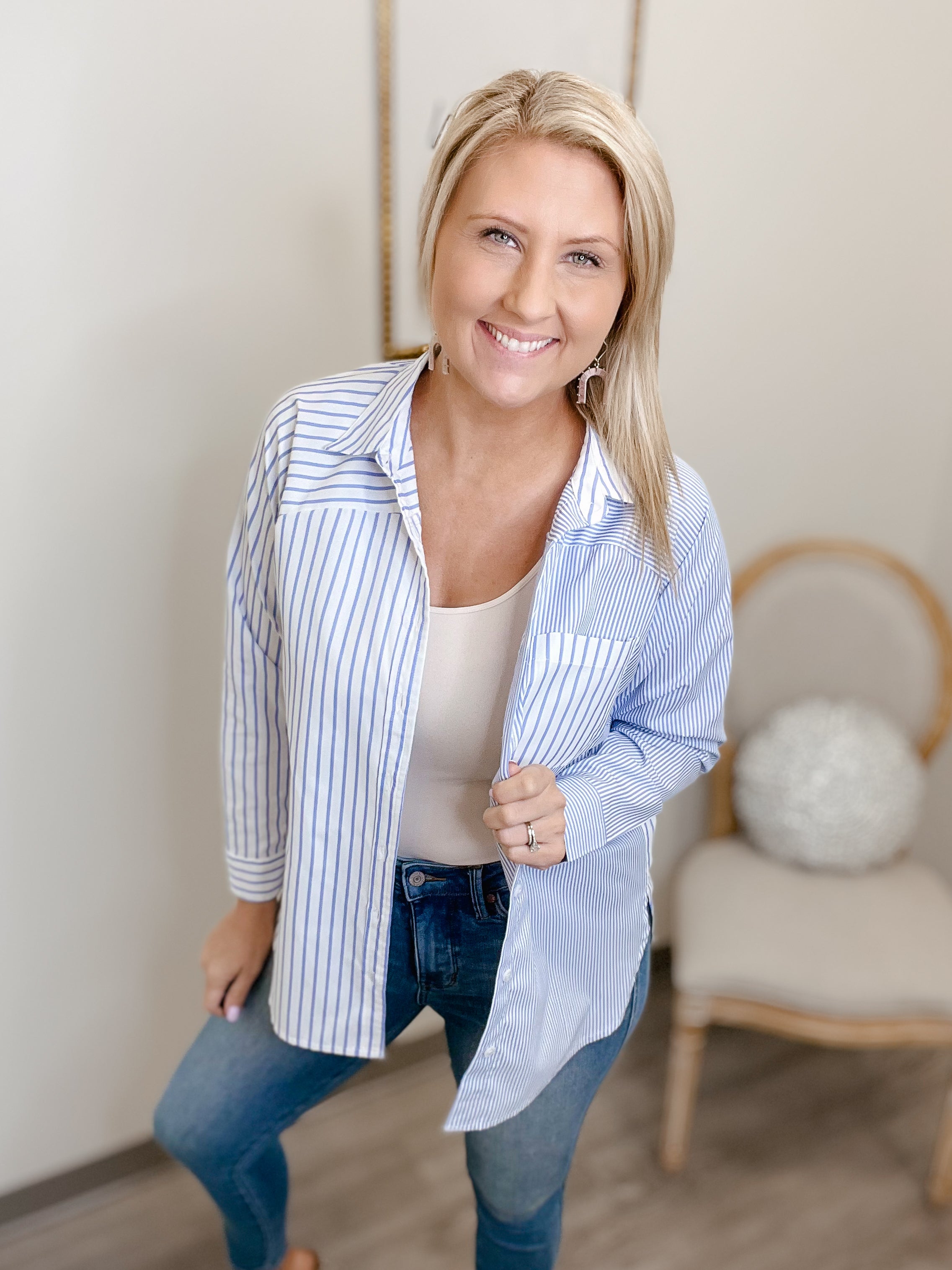 Colorblock-striped top with a collared neck, chest 1 pocket, back box pleated, long shirt sleeves, and vented hemline. - Button-front, non-sheer, lightweight.