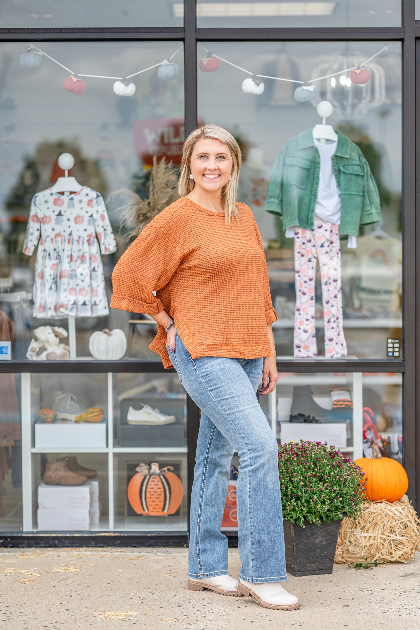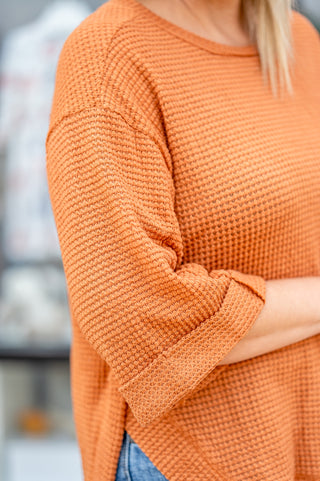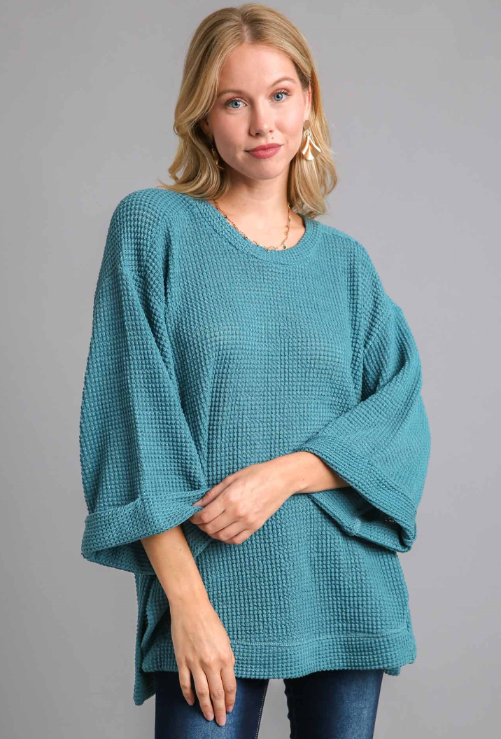 Waffle Knit top features a 3/4 Rolled Sleeve and a Round Neckline