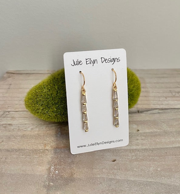Gold and crystal baguette earrings. Feature 4 baguette cut crystals on a gold drop post with a hook backing.