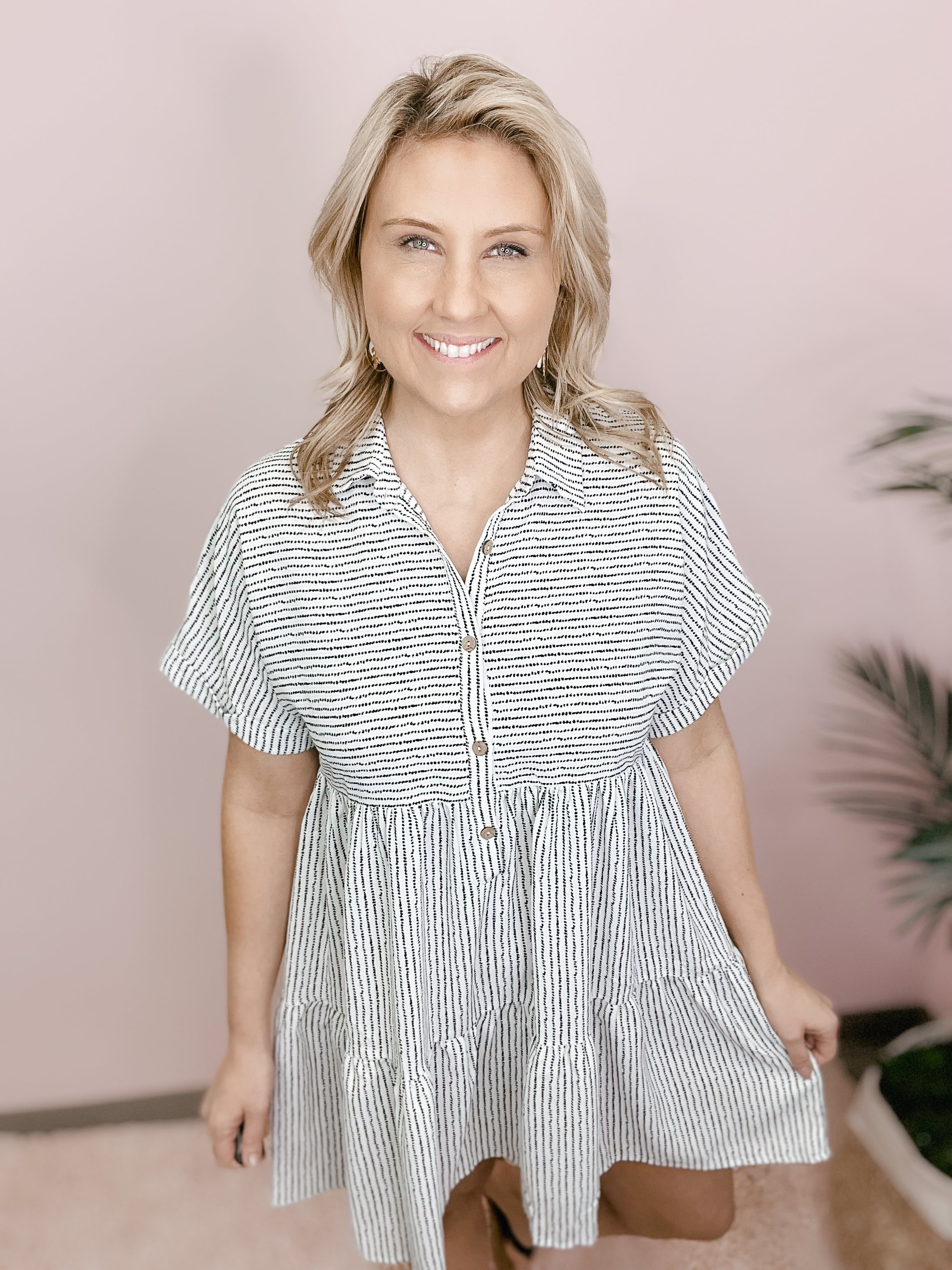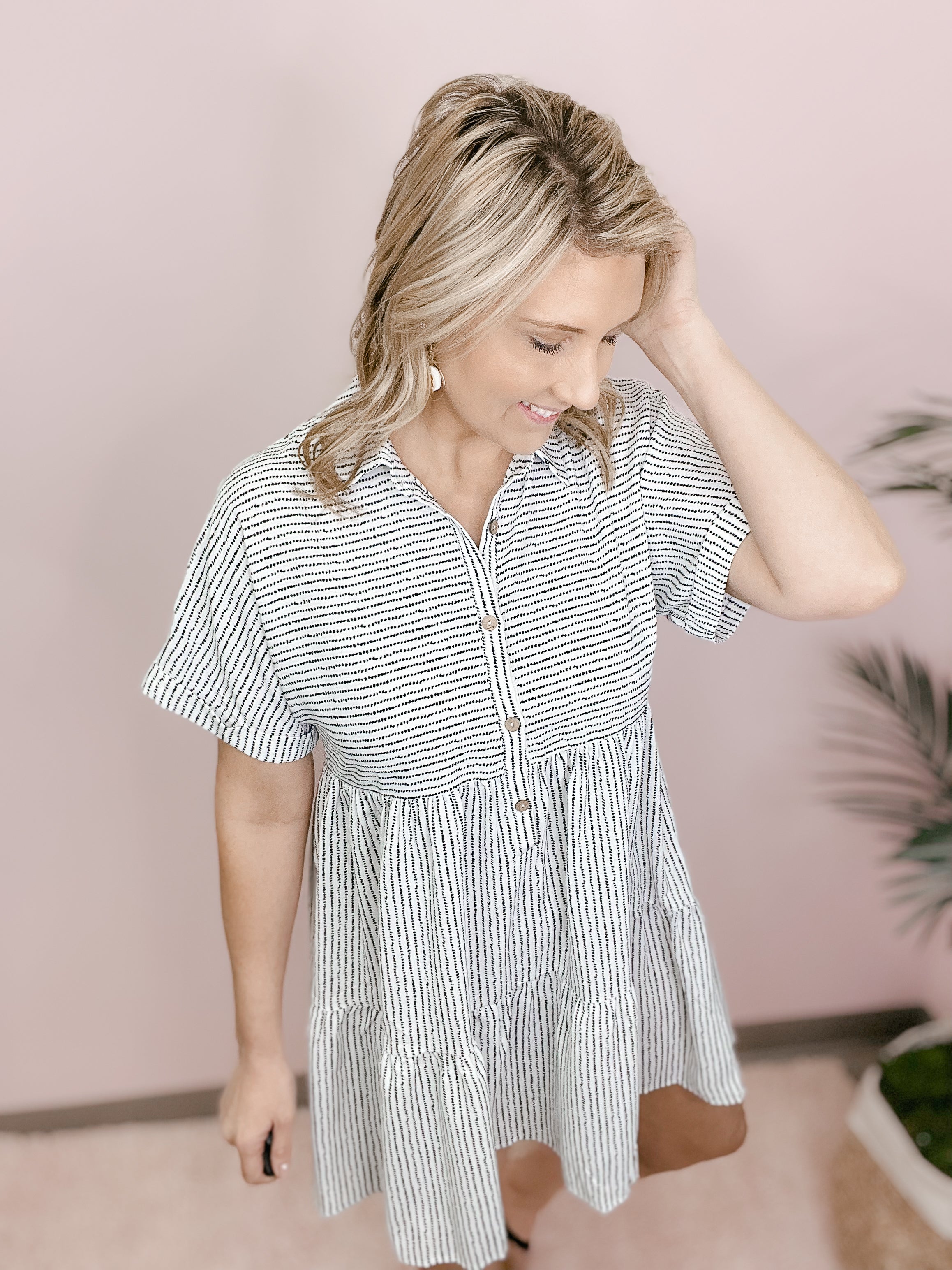 Striped print dress with buttoned collar neck, cuffed short sleeves, and tiered skirt. - Unlined, non-sheer, lightweight.