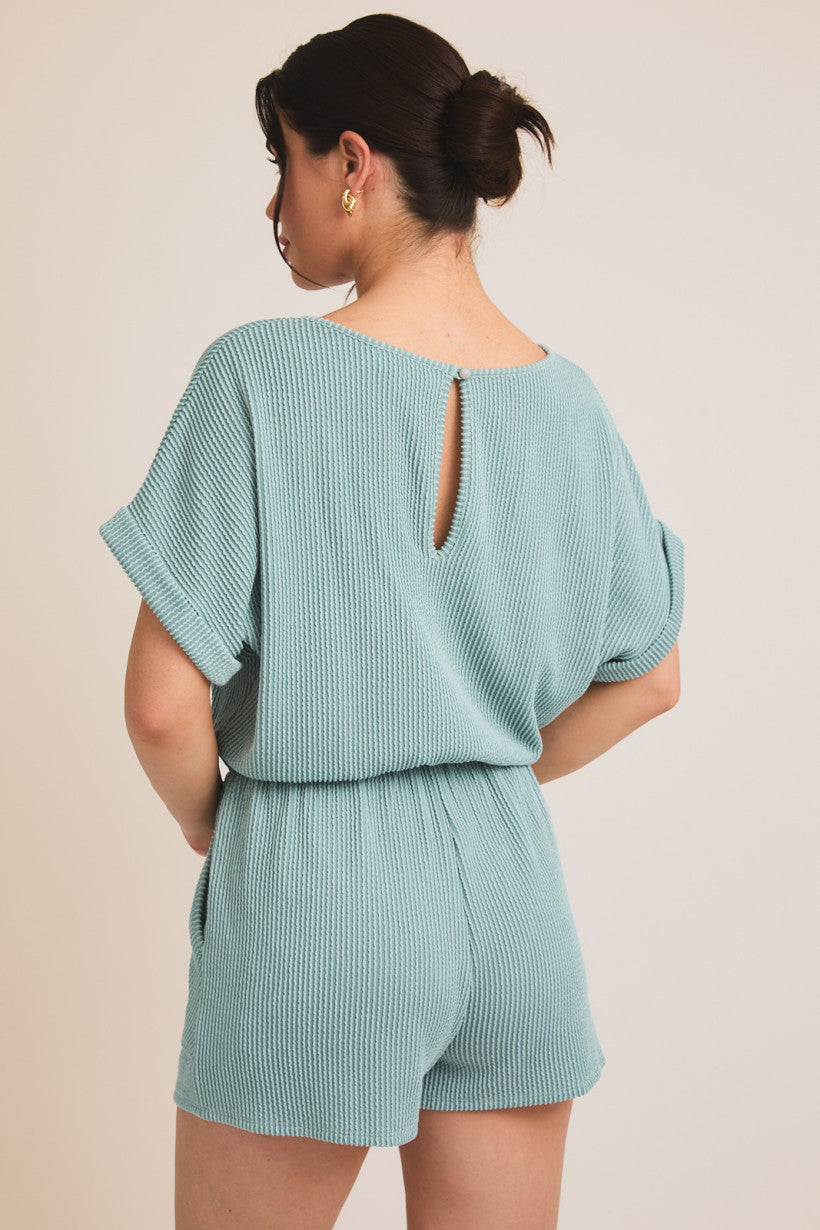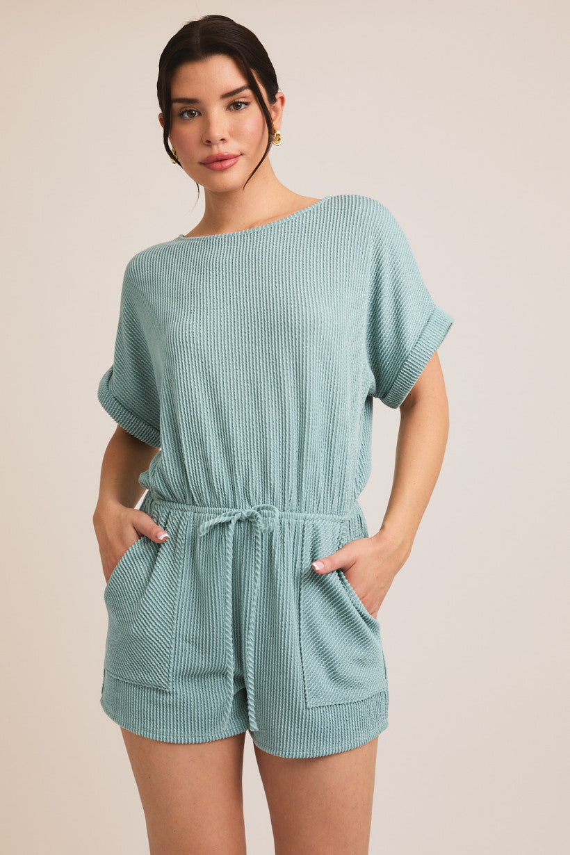 SHORT ROLL UP SLEEVE ELASTIC WAIST FRONT POCKET ROMPER