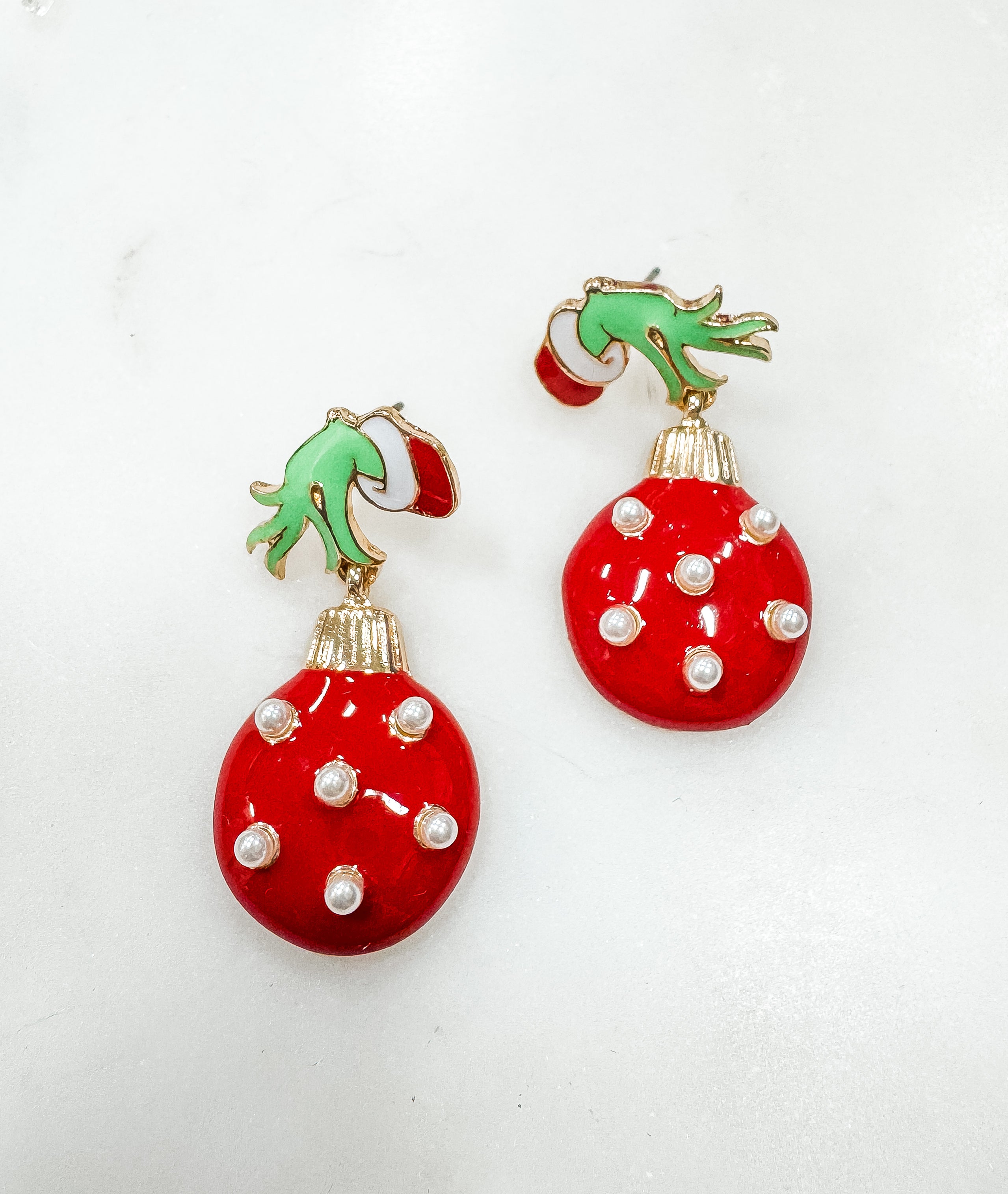 Add a touch of holiday magic with the Whoville Whimsy Drop Earring. Featuring a playful Grinch hand holding a festive ball ornament, accented by delicate pearls, these earrings bring charm and cheer to any outfit. Perfect for spreading whimsical holiday spirit with every wear.