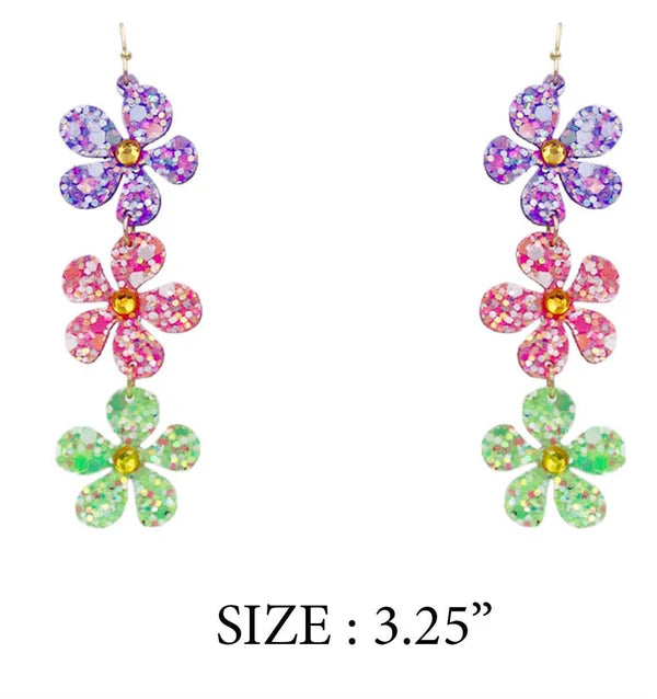 Multi Glitter Flower 3 Drop 3.25" Earring.