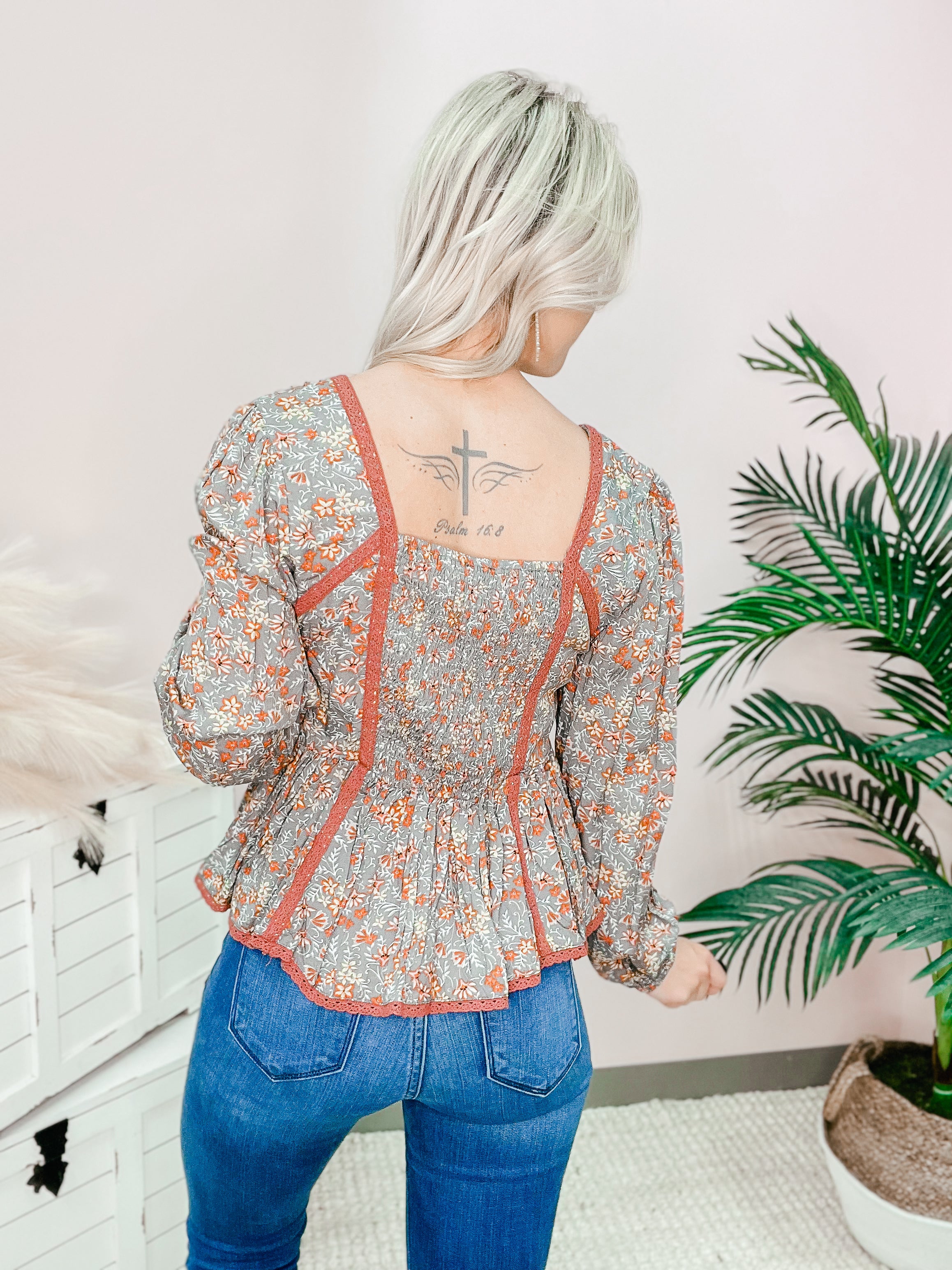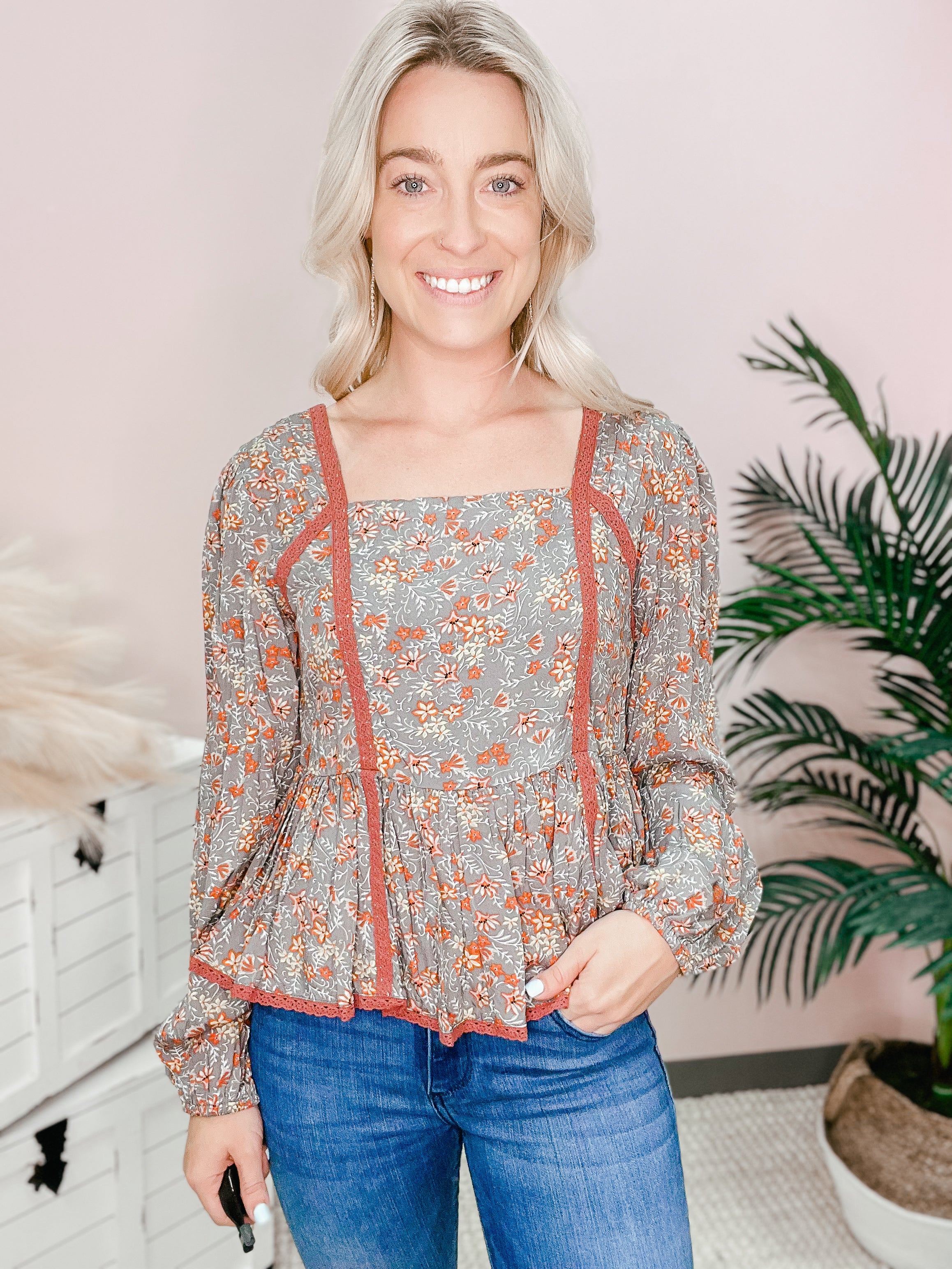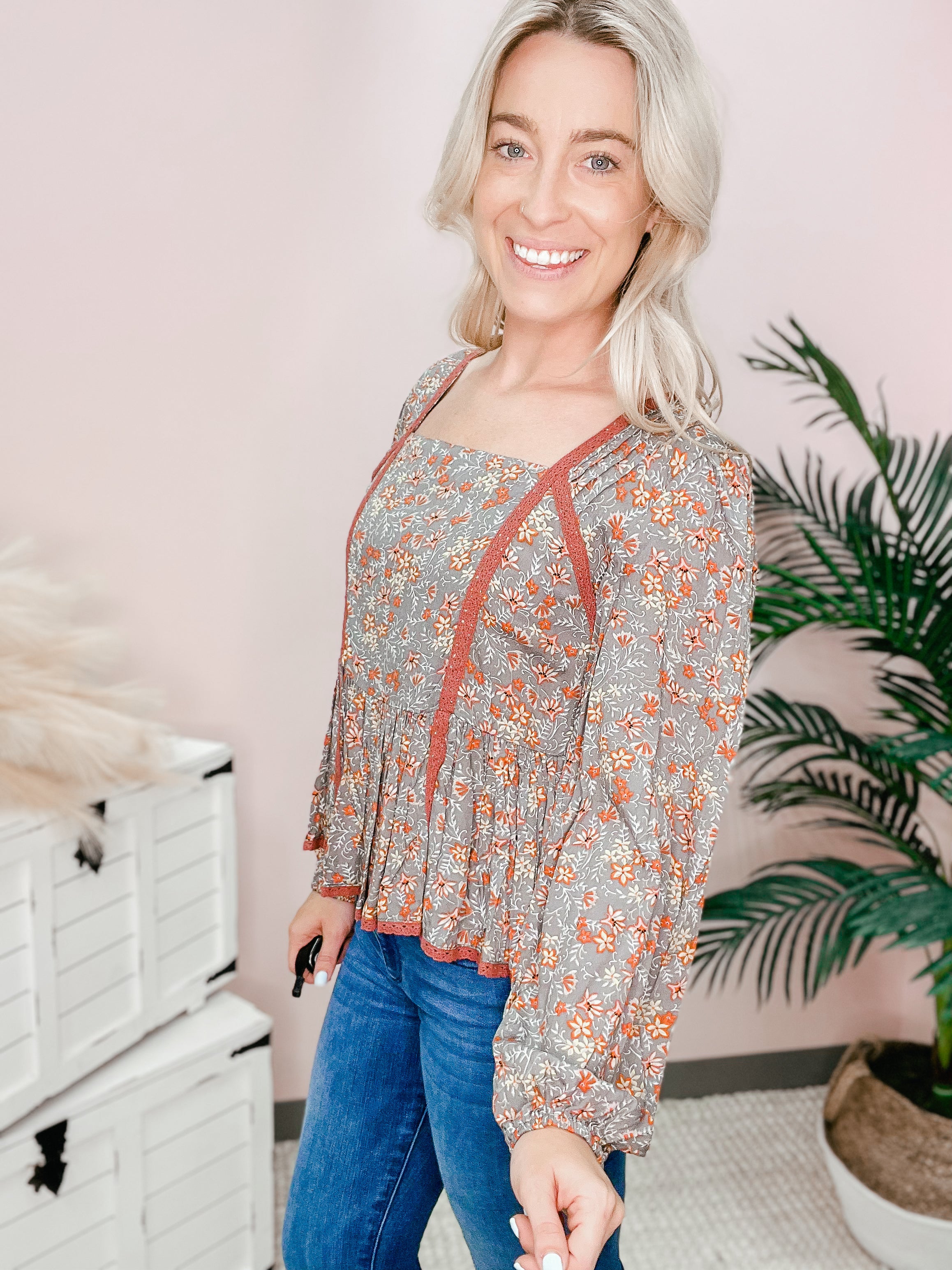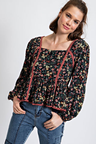 FLORAL PRINTED PEPLUM TOP -SQUARE NECKLINE -BUBBLE SLEEVES -LACE TAPE DETAILING -RUFFLED BOTTOM