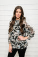 Print chiffon top with frilled neck, back keyhole, and raglan long poet sleeves. - Semi-sheer, lightweight.
