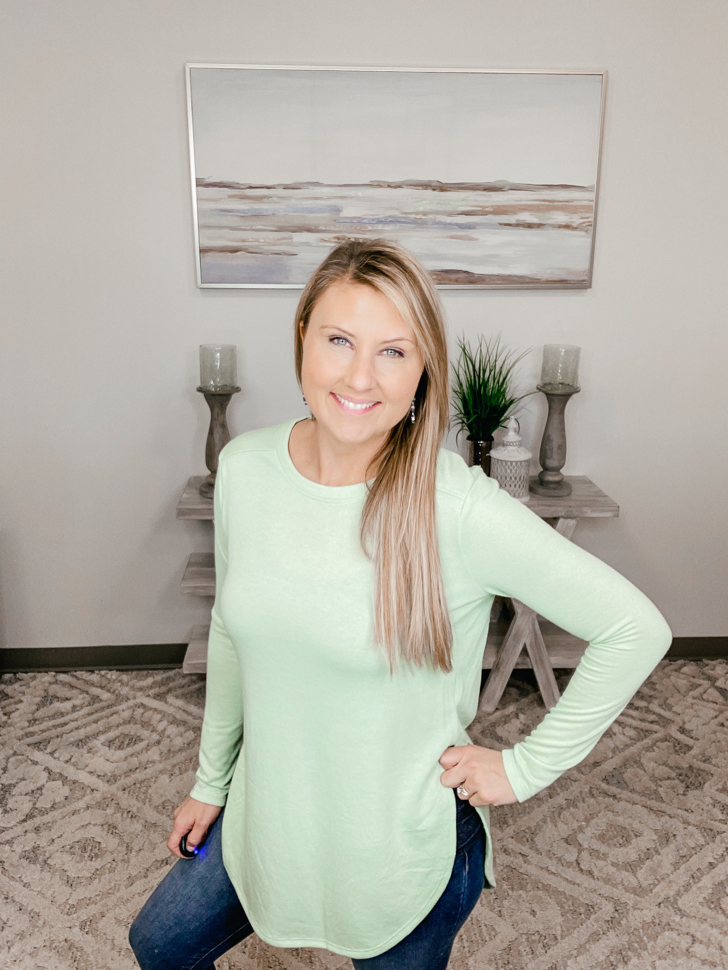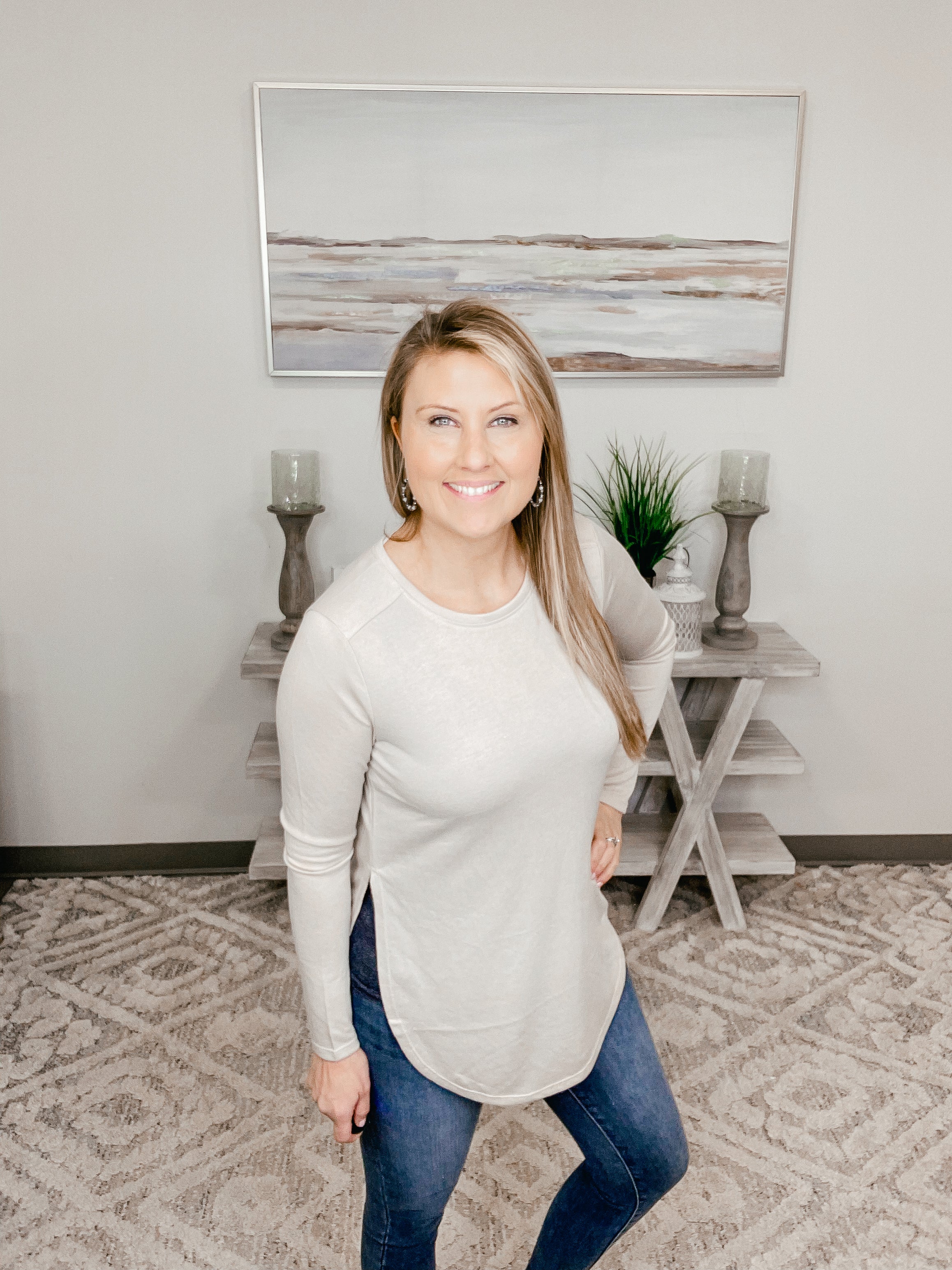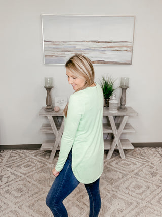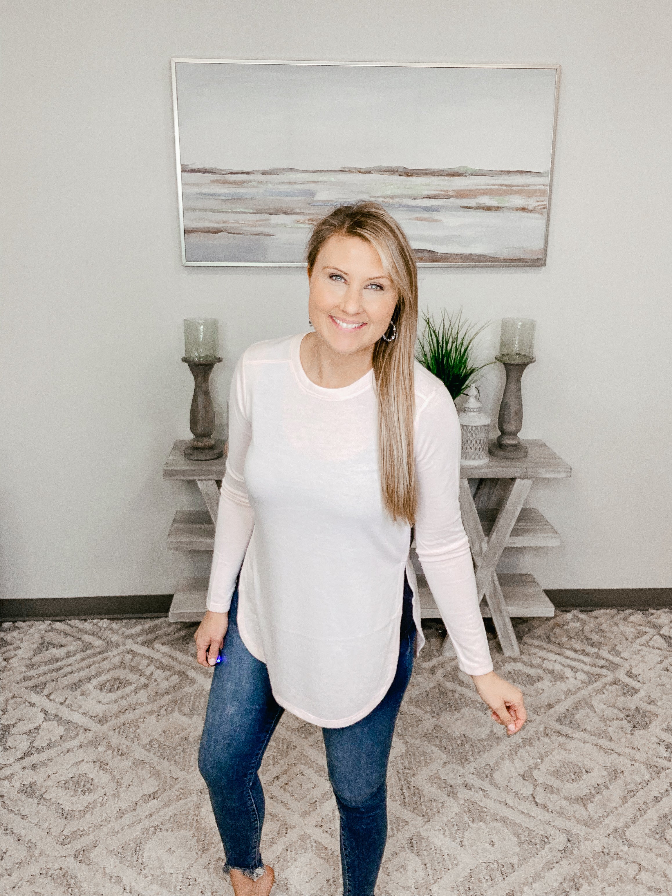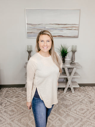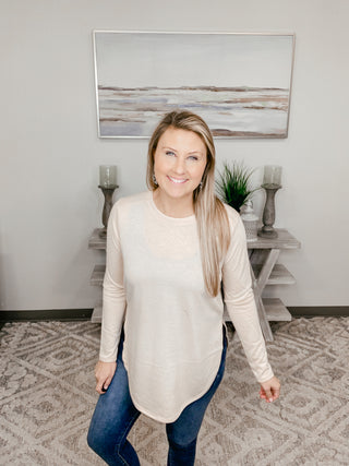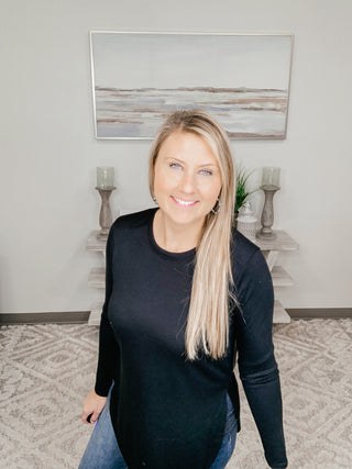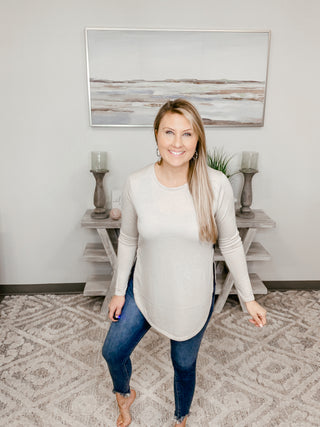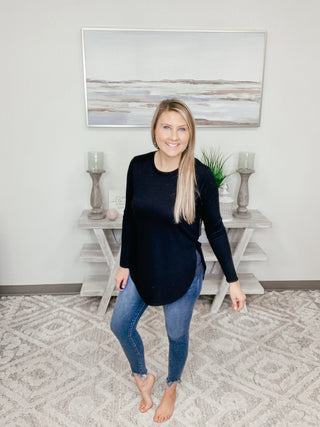This no-frills long-sleeve top features curved bottom hems and slit on each side that goes all the way up to the hips. Wed recommend pairing it with leggings or denim pants for an eclectic look.