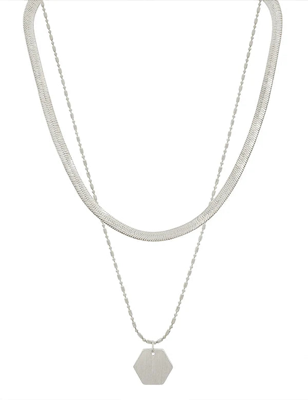 Matte Silver Snake Chain with Hexagon Layered 16"-18" Necklace