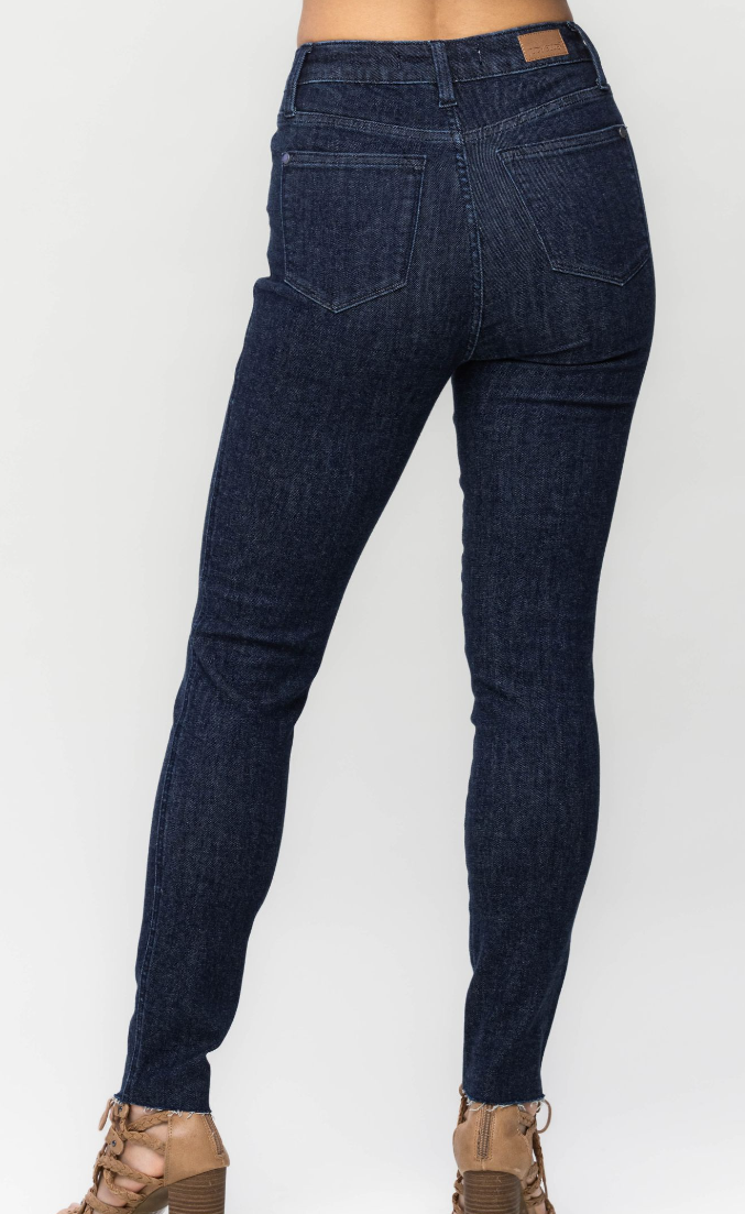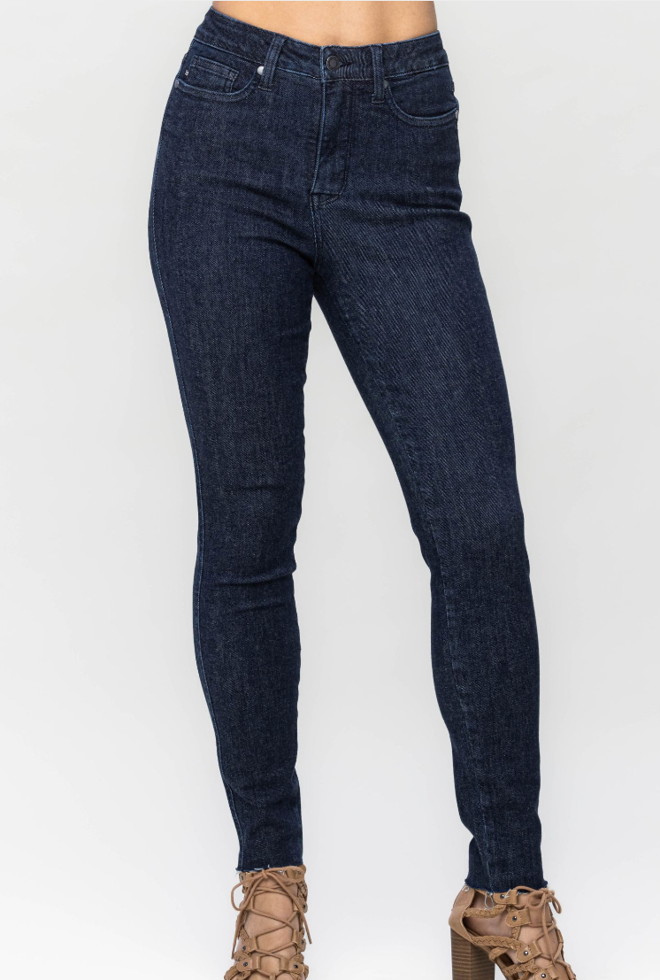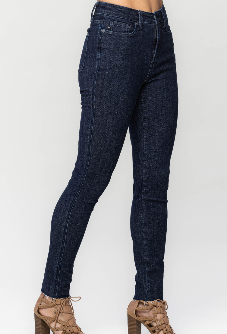High Waist Tummy Control Raw Hem Skinny - Dark Wash