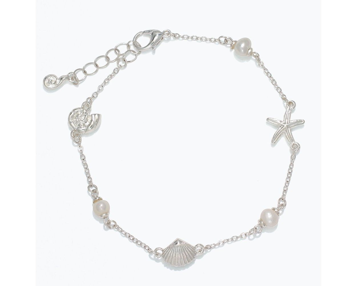 Silver bracelet with sea life such as a starfish and shells and pearl charms.
