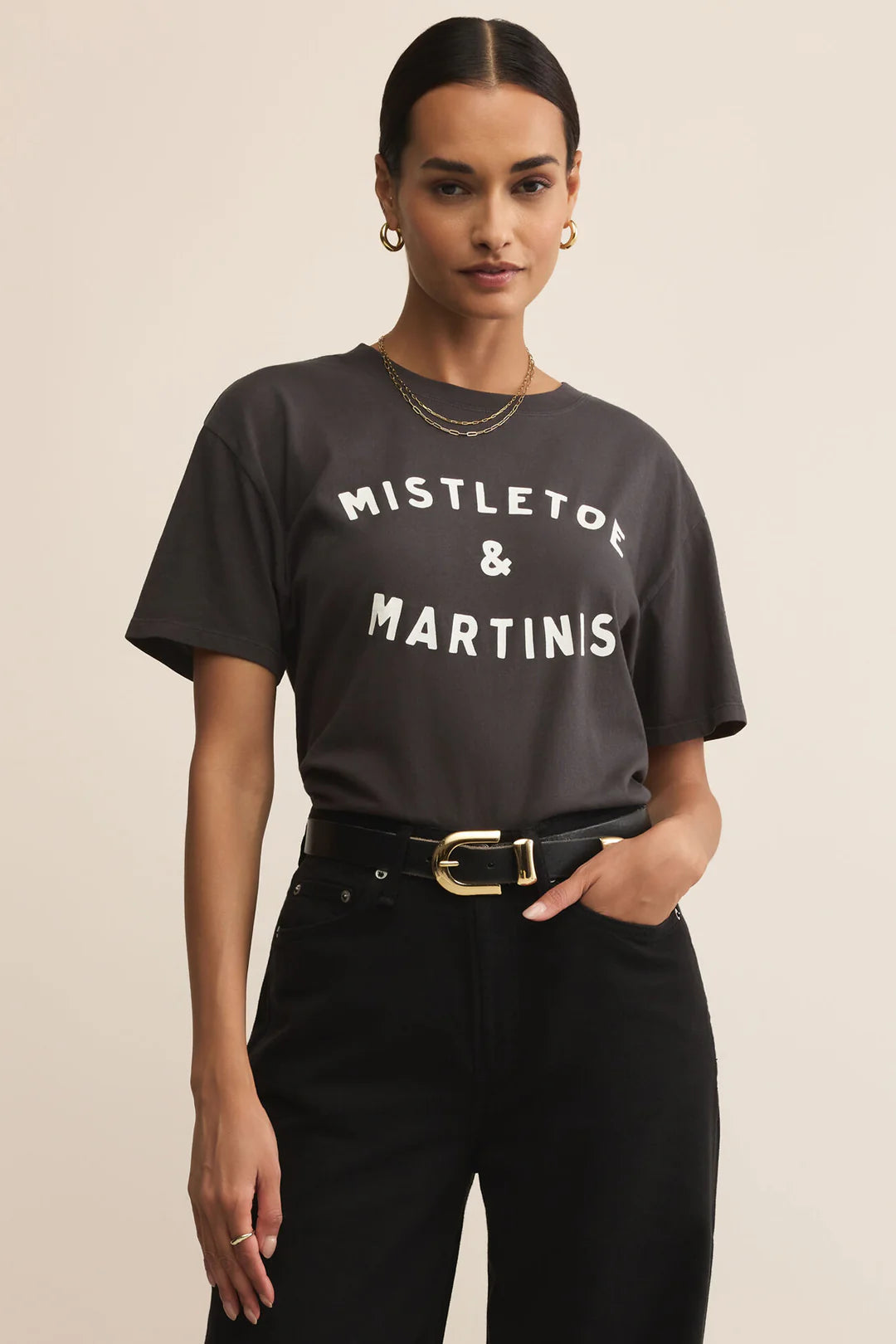 Get ready to party this holiday season with the Mistletoe & Martini's Boyfriend T-Shirt! This playful tee adds a fun twist to festive fashion, perfect for cozy gatherings or spirited parties. Show off your cheeky side while staying comfy and cute—because cuddles and cocktails go hand in hand!
