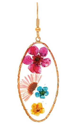 Embrace the beauty of nature with our Gold Multicolor Pressed Flowers Oval Earrings! Featuring real dried flowers delicately preserved in clear resin, these earrings showcase a stunning mix of vibrant pink, blue, yellow, and peach blossoms encased in a gold-tone oval frame. The lightweight design and transparent background create a fresh, airy look, perfect for adding a touch of nature to any outfit.