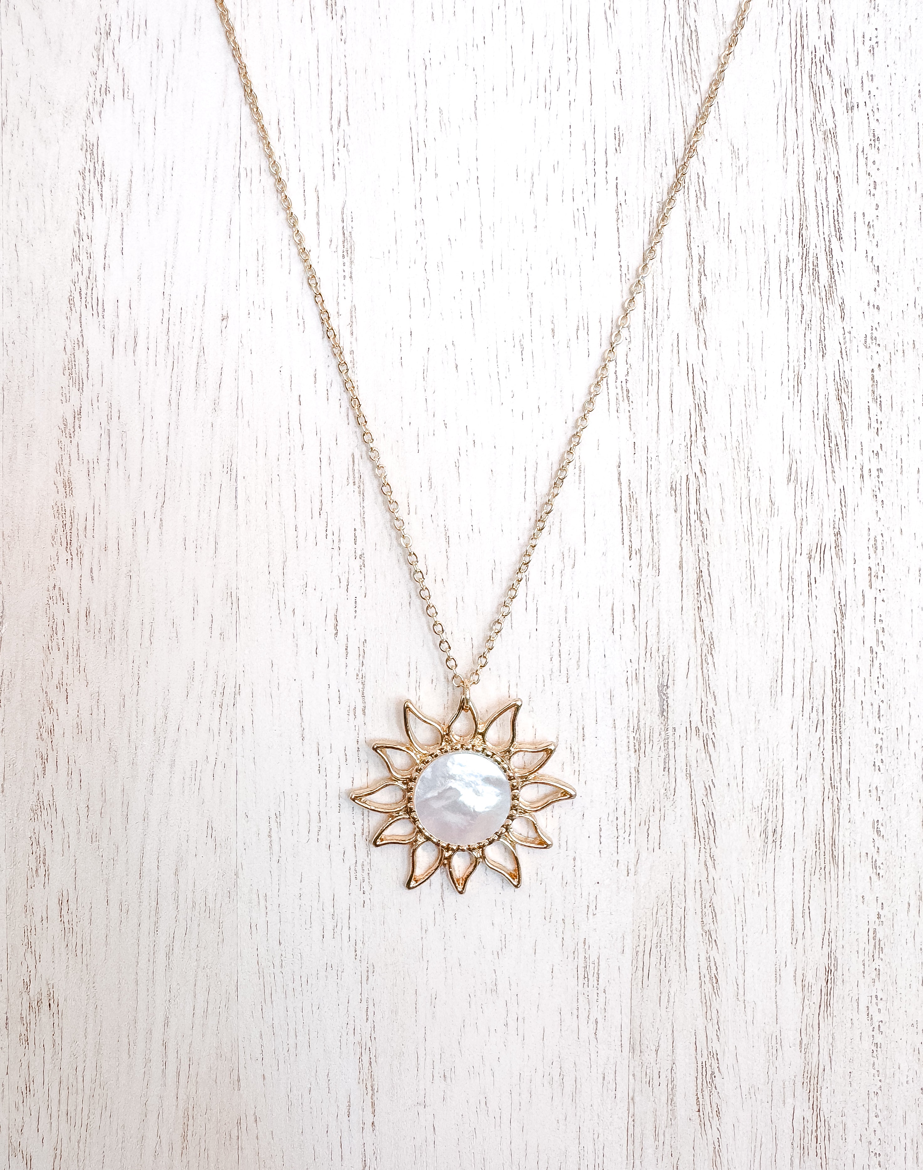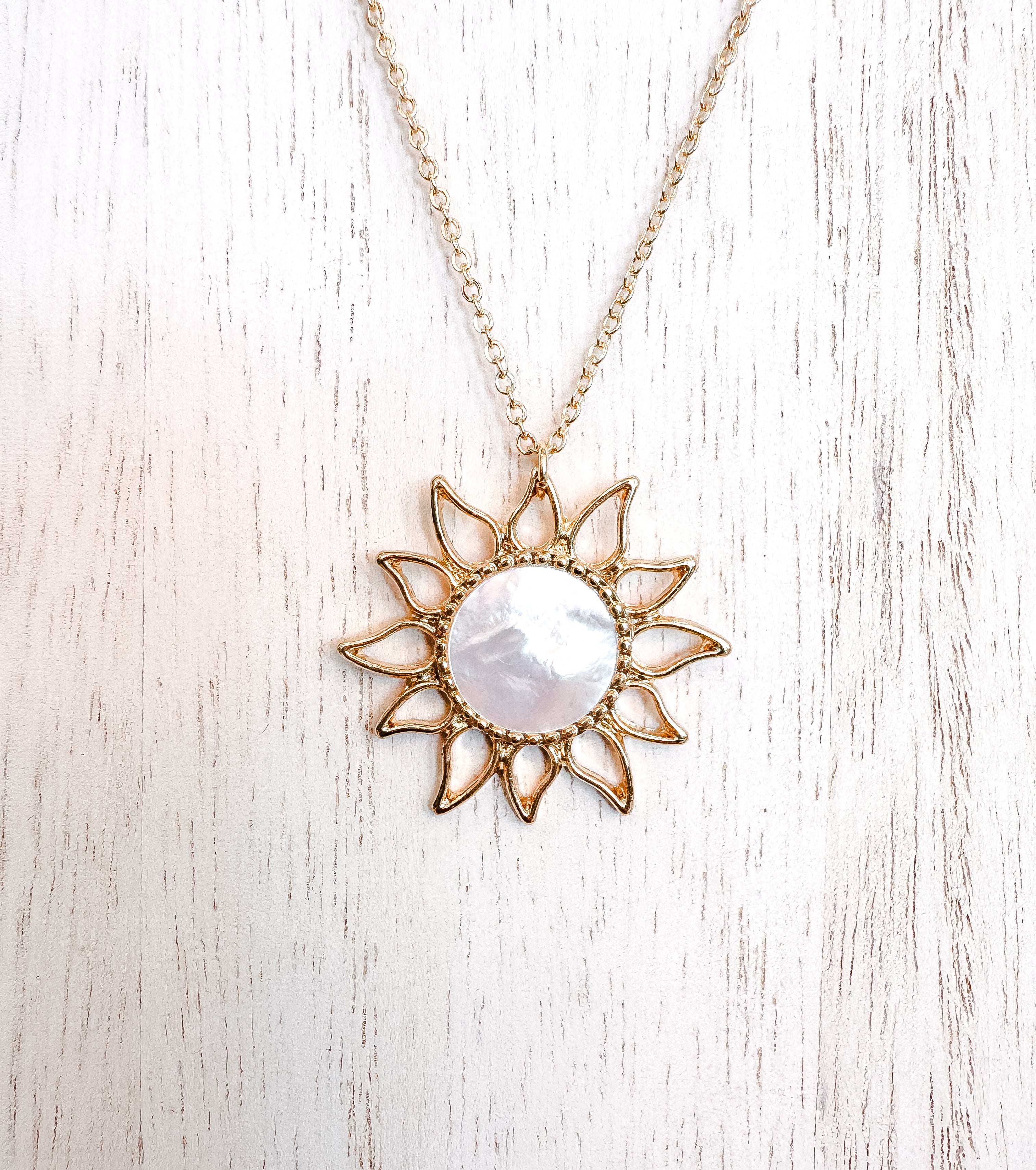 Shine bright with our Sun Kissed Sun Necklace! Made of lightweight gold, this necklace features a dazzling opal center. Add a touch of sunshine and sparkle to any outfit. Perfect for sunny days and starry nights. Sun-kissed not guaranteed.