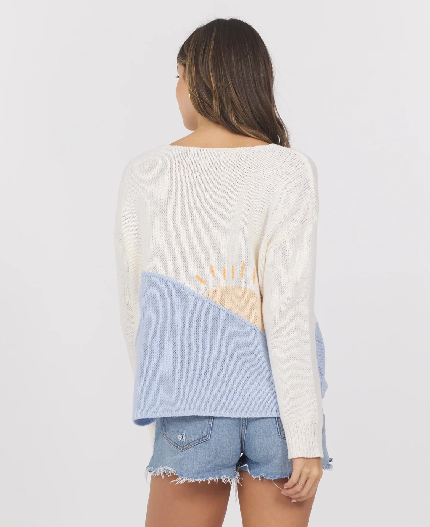 Stay warm and stylish with our Ocean Sunrise Beach Sweater. This playful sweater features a cure sunny detail and a chest pocket, perfect for storing your essentials. Made from a soft knit material, you'll love its cozy feel. Don't miss out on this quirky and fun addition to your wardrobe!