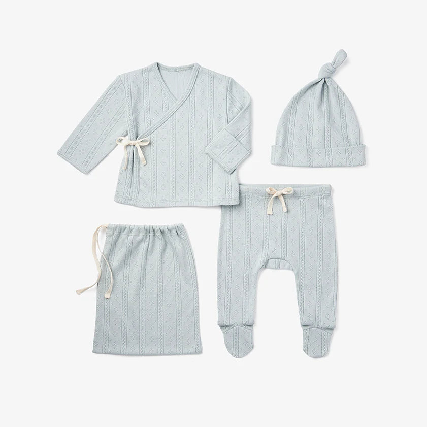 A collection of luxury newborn essentials that are almost as dreamy as that new baby smell. Make a little one's homecoming extra special with this four-piece set of super soft, elegant pointelle knit outfit, packaged in a re-usable drawstring bag.