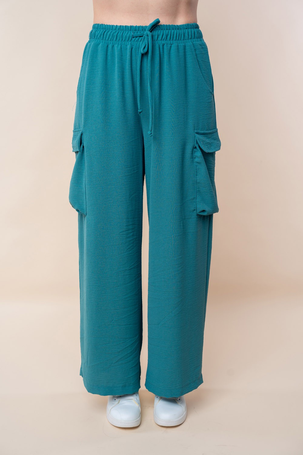 High-waisted solid knit cargo pants with an elastic waist featuring side pockets and an adjustable self-tie. Fabric is a lightweight knit.