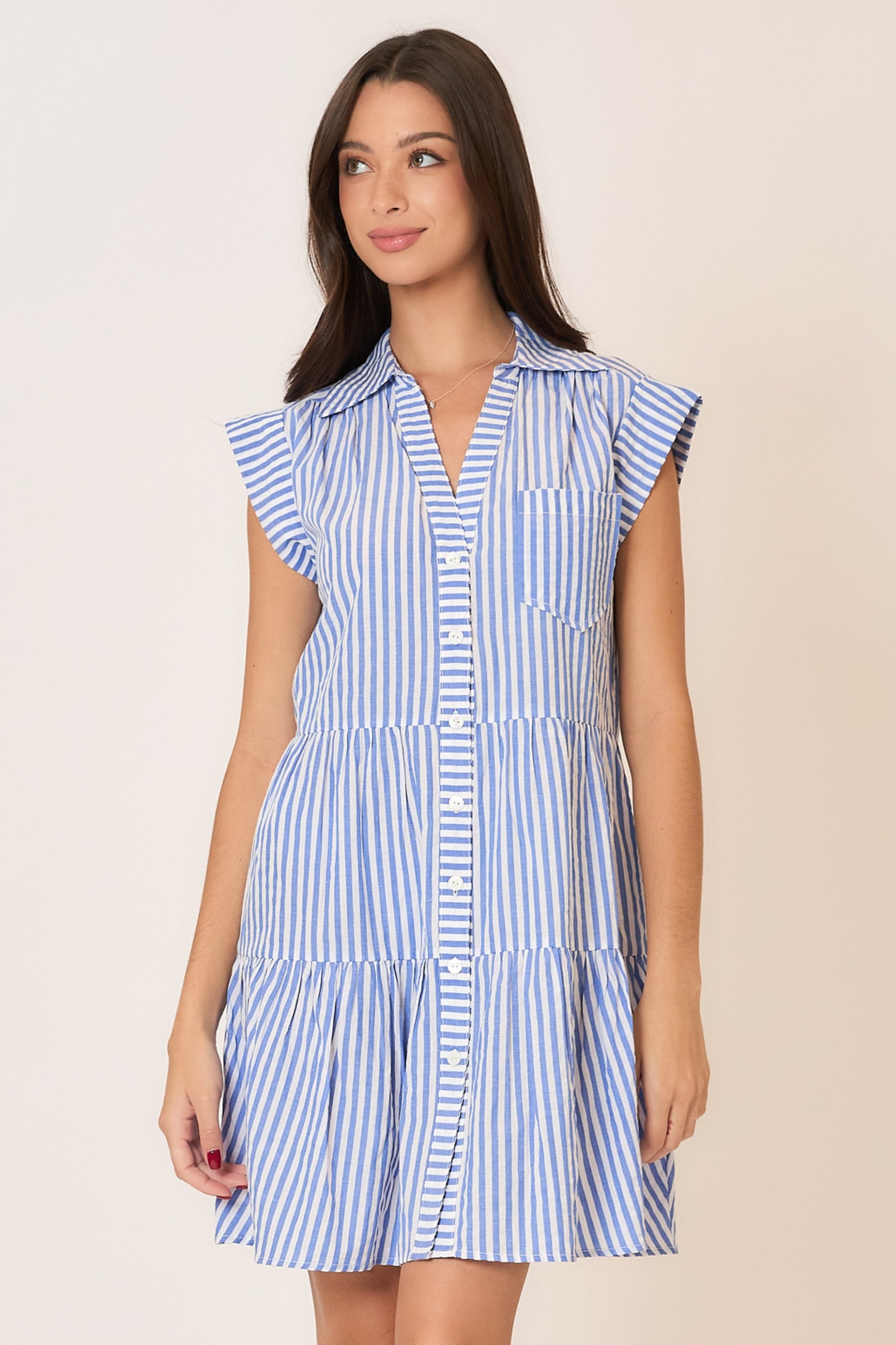 Get ready to turn heads with the Start Of Something Dress! Featuring a fun stripe print and a stylish button-down front, this dress brings playful charm to your wardrobe. The unique layering hem adds a flirty twist, perfect for any occasion where you want to stand out. Embrace the start of something fabulous!