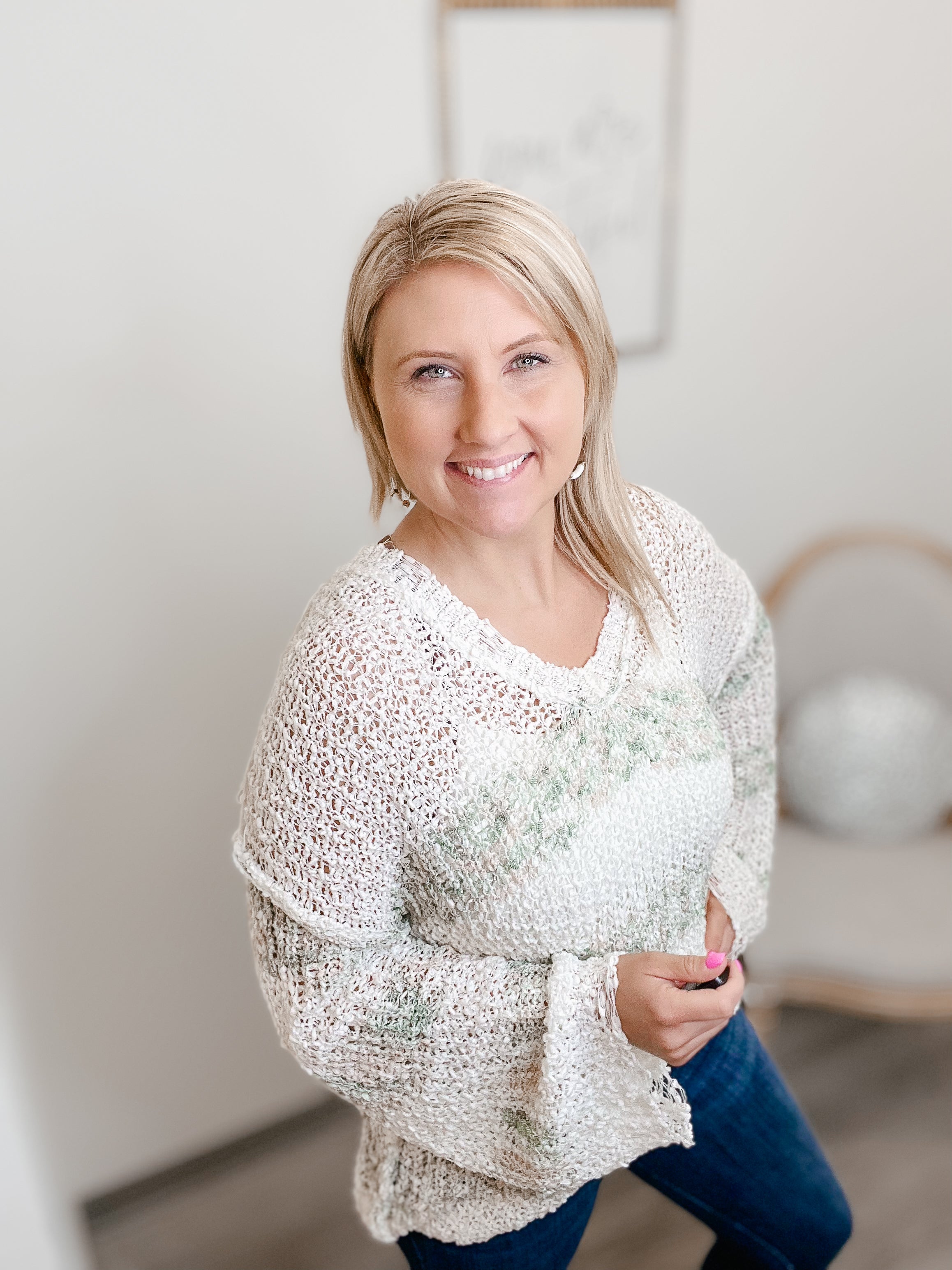 Designed V-neck, oversized fit with distressed edge, featured in thin sweater with color mix.