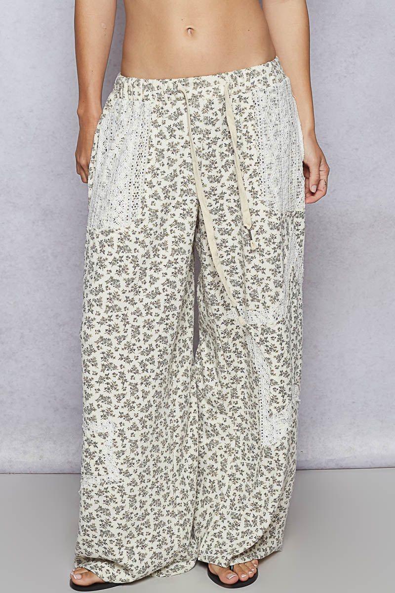 Designed in wide pants in rib with crochet star patch, outseam, pocket detail, edge cut, vintage washing.