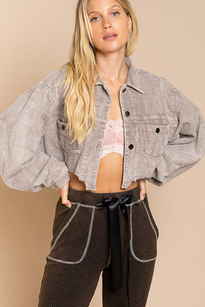 Designed in cropped jacket with button closure, relaxed fit, balloon sleeve with button closure, chest pockets on front, distressed edge detailing, small patch with STAR embroidery on back, featured in corduroy.
