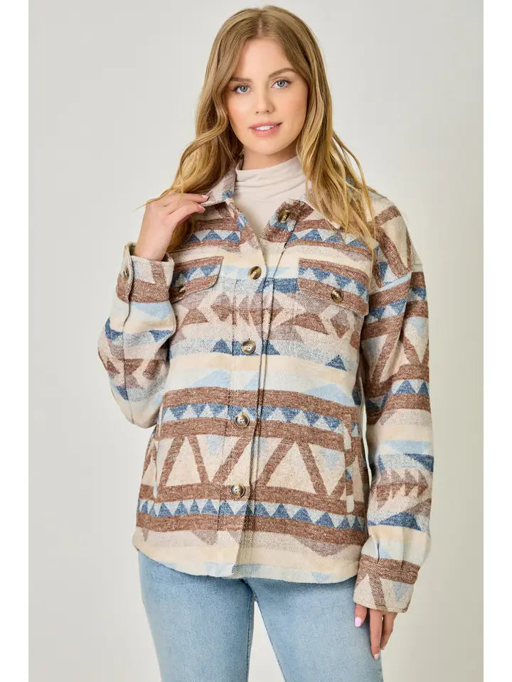 Aztec Shirt Jacket Chest pockets Side pockets Long sleeves Hi-lo hem