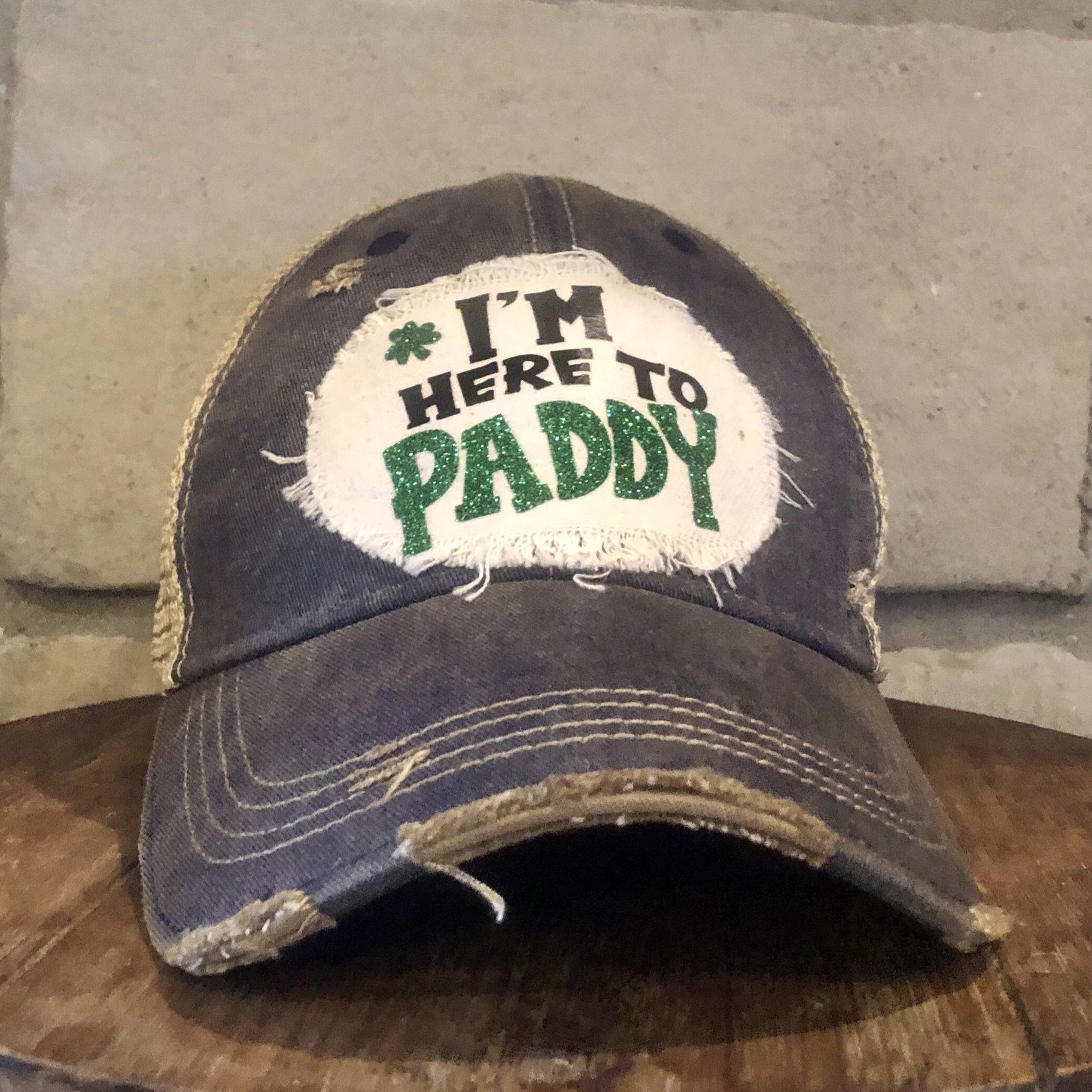 Distressed, vintage feel baseball hat. This super-soft I'm here to Paddy cap would make anyone smile. It is a custom creation by BohoGroove featuring a weathered snapback cap and an oversized Green Sparkly St.Patrick's Day logo. It is sure to add a little luck to your day!