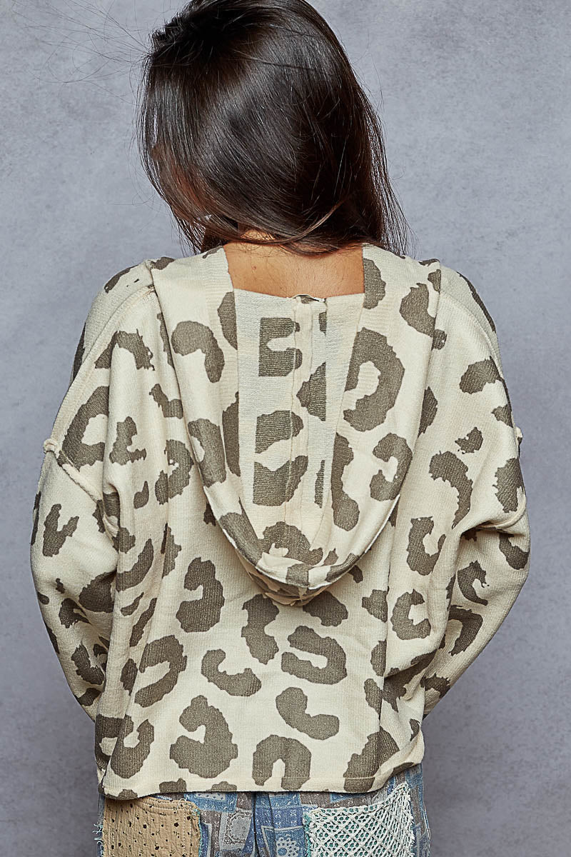 Designed in V-neck long sleeve relaxed fit hoodie sweater top in acrylic with animal print, rib band, rolling edge.