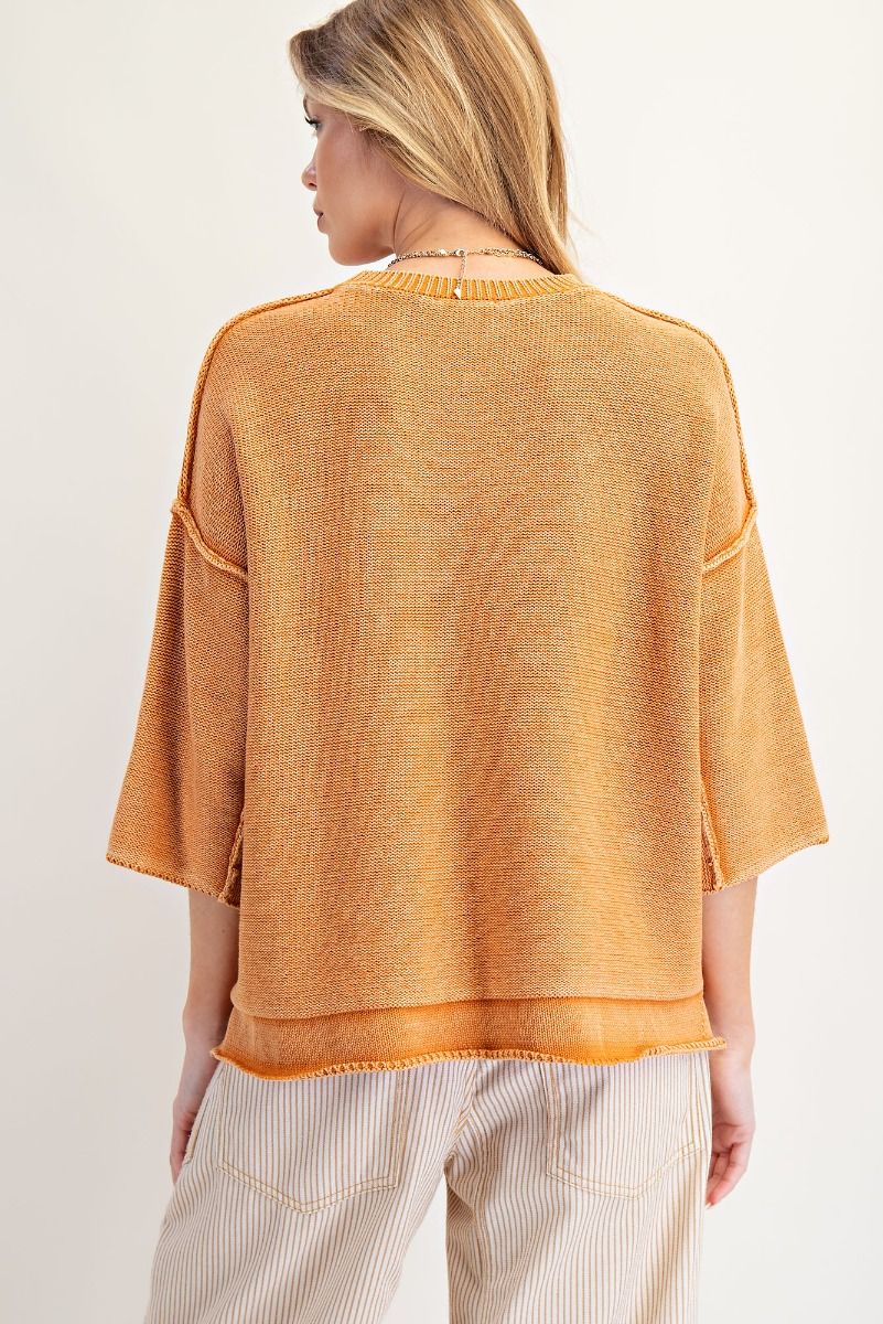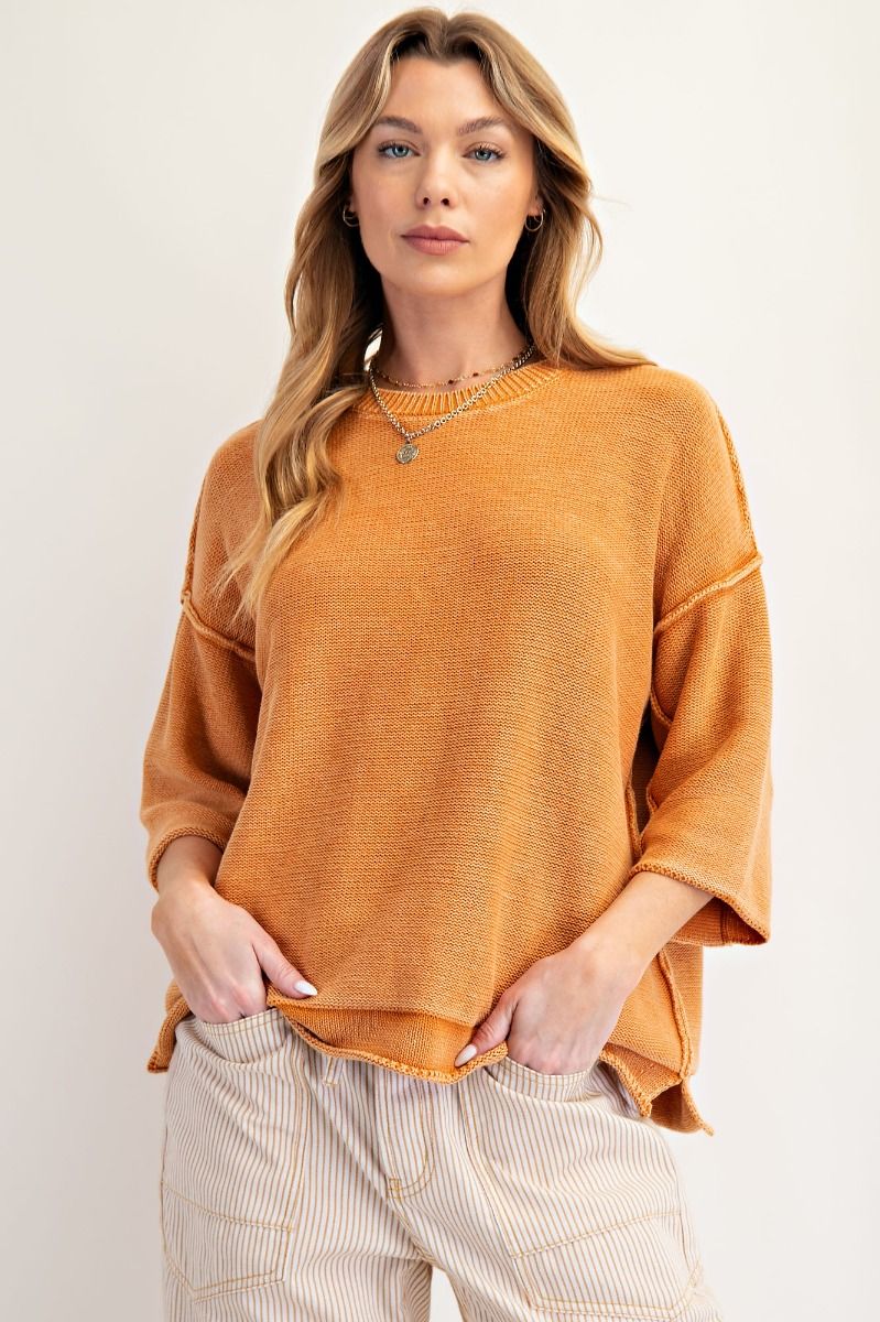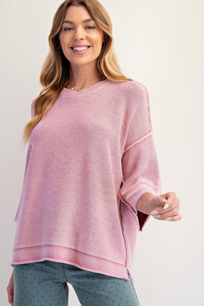 MINERAL WASHED KNIT SWEATER TOP -HALF SLEEVES -ROUNDED NECKLINE -DROPPED SHOULDERS -DEFINED SEAMS -SIDE SLITS -RELAXED AND LOOSE FIT