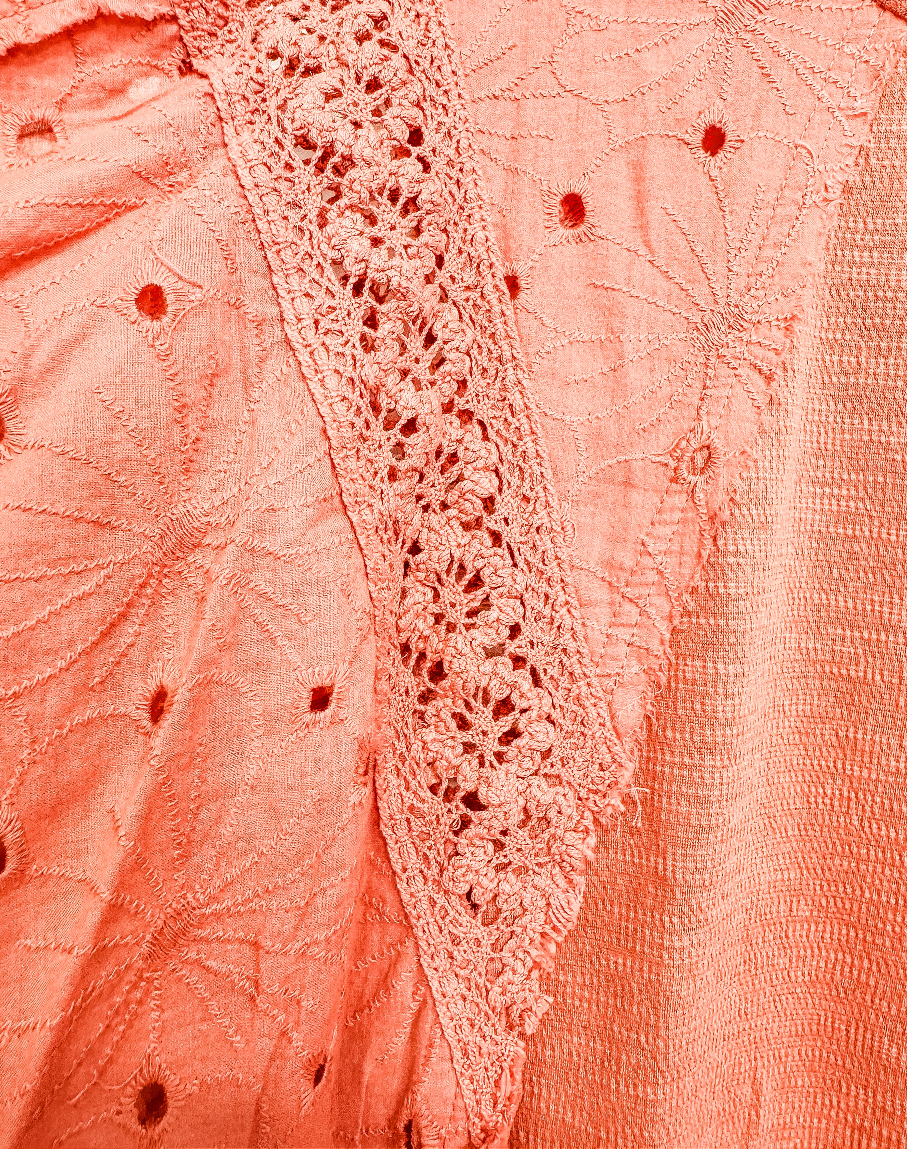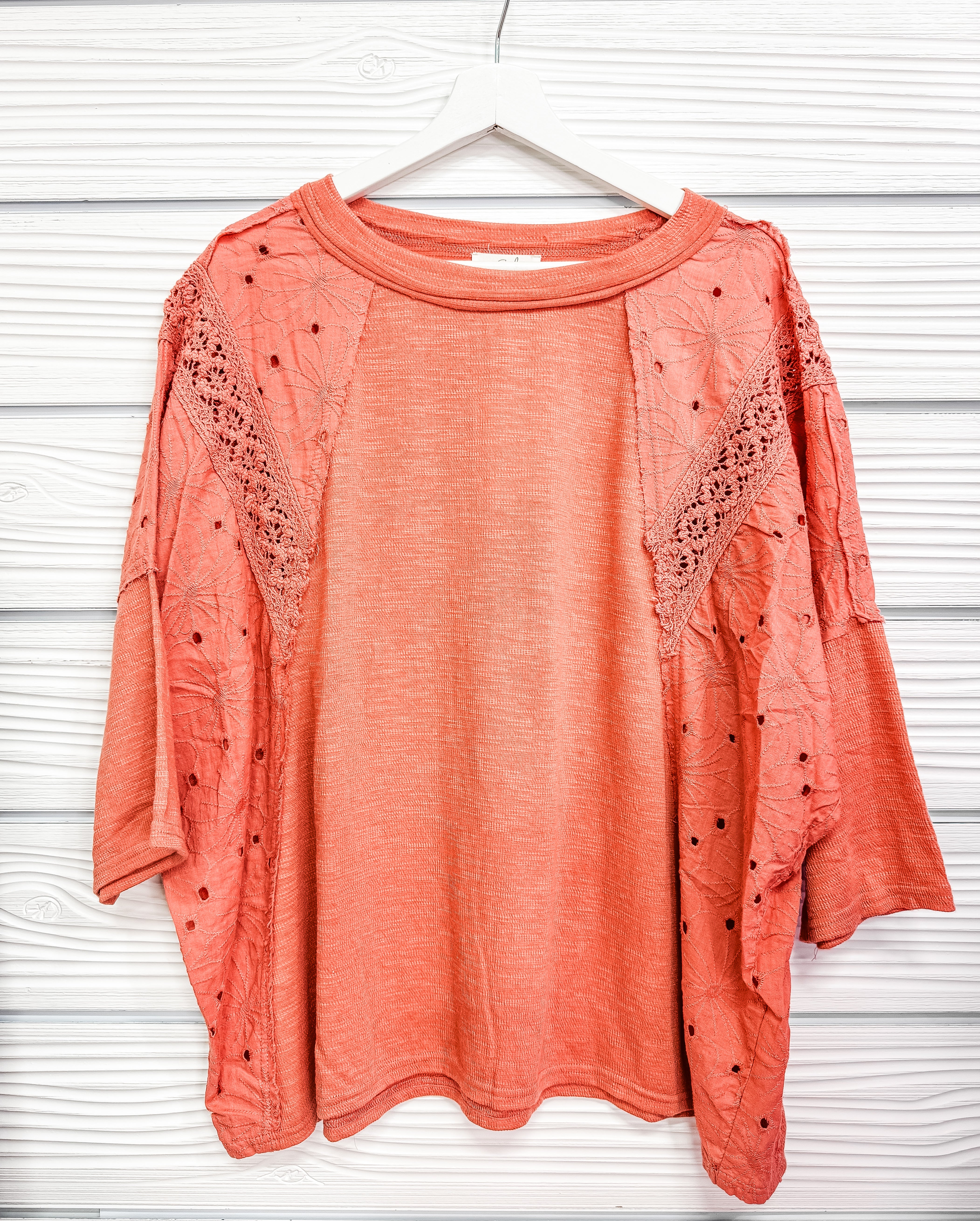 Top features an eyelet and crochet detail, ribbed and embroidered floral design.