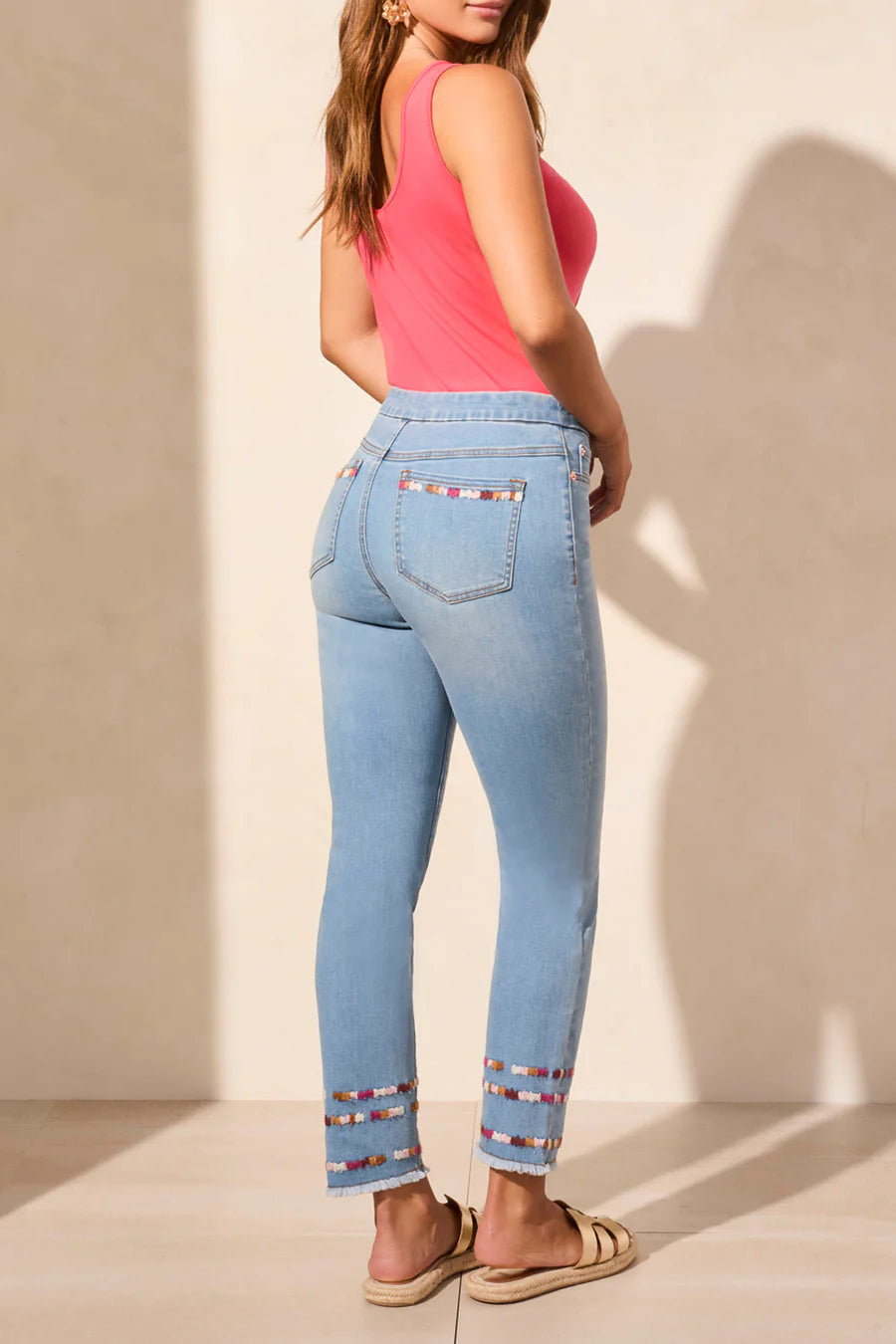 Expertly crafted for maximum comfort and style, the TRIBAL Mid Rise Alexa Pull On Embroidered Slim Ankle Jeans are a must-have for any fashion-forward wardrobe. The pull-on design eliminates uncomfortable buttons and zippers, while the slim ankle cut and intricate embroidery add a touch of flair to any outfit. Trust us, you won't want to take them off!