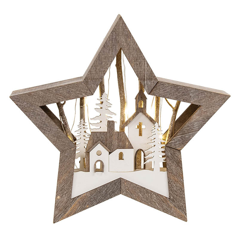 This Wooden Light Up Star With Church Scene is a beautiful addition to any holiday decor. The intricate church and wintery scene is crafted from high-quality materials and lights up for a warm and inviting glow. The perfect way to add a touch of charm and tradition to your home.