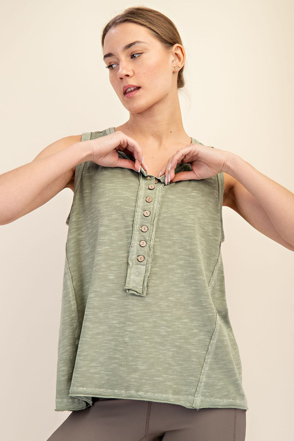 Introducing The Sloane Button Down Tank Top. A mineral washed sleeveless Henley top made from soft, breathable fabric featuring a classic buttoned neckline and a relaxed fit. It's perfect for effortless everyday style and easy layering!