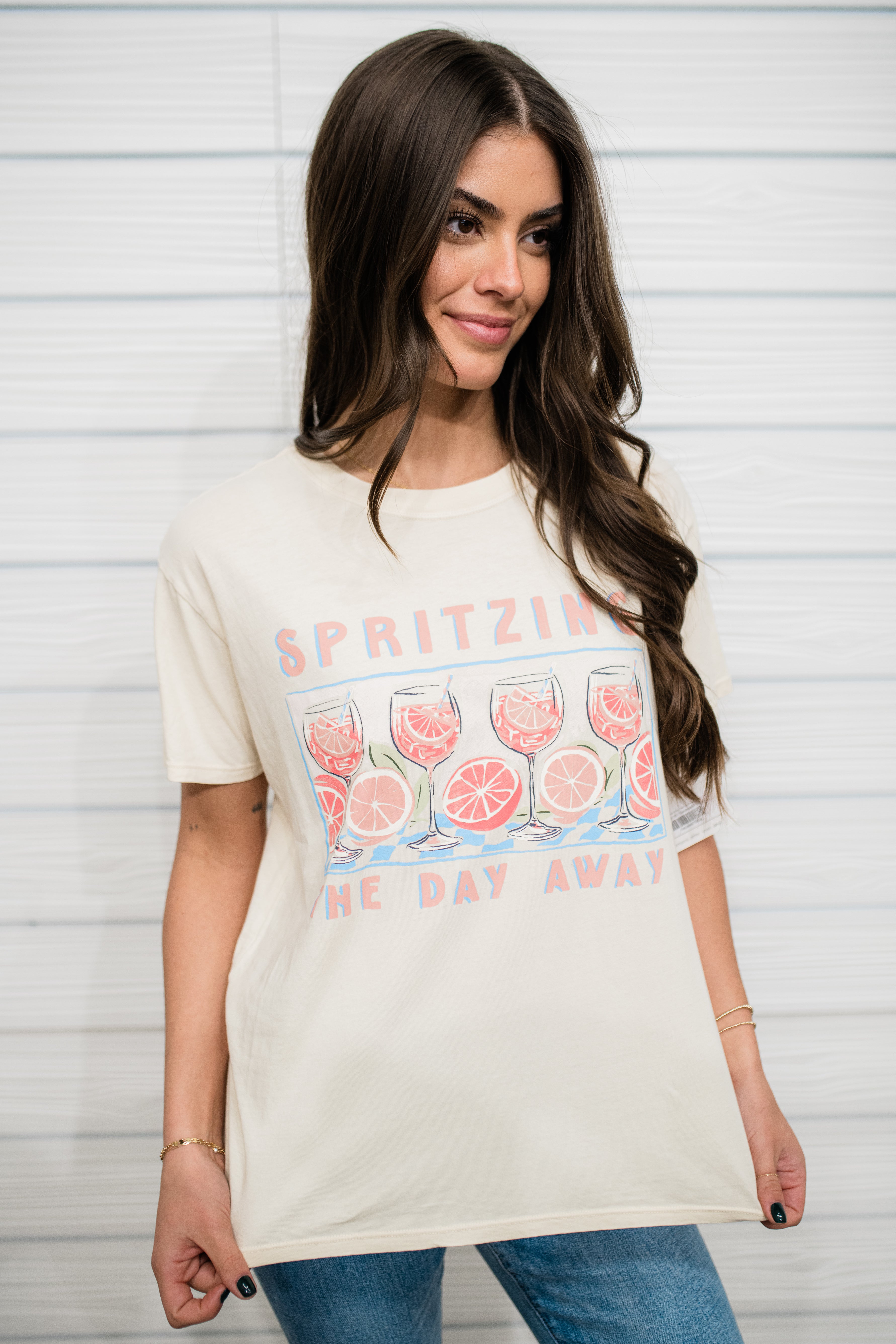 Citrus-soaked and playful, this relaxed tee brings the vibes with a colorful screen print with the phrase "Spritzing the Day Away." Made from soft 100% cotton jersey, it’s your perfect companion for laid-back afternoons and spontaneous adventures.